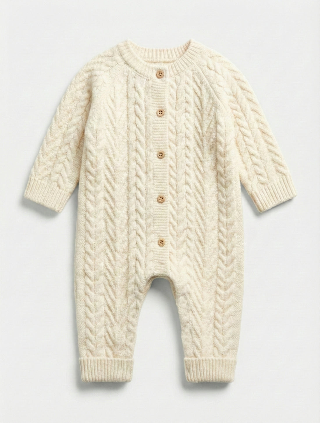 Soft cable-knit romper featuring an intricate braided pattern down the front. Designed with a round...