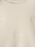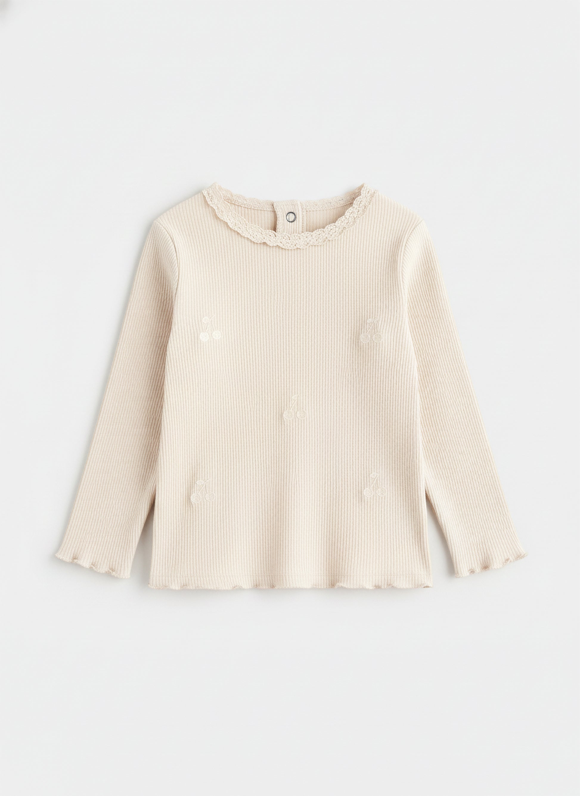 Keep it timeless with this ribbed full-sleeve T-shirt crafted from soft, breathable cotton. The subtle cherry embroidery and delicate lace neckline make it both stylish and comfy—perfect for any occasion.