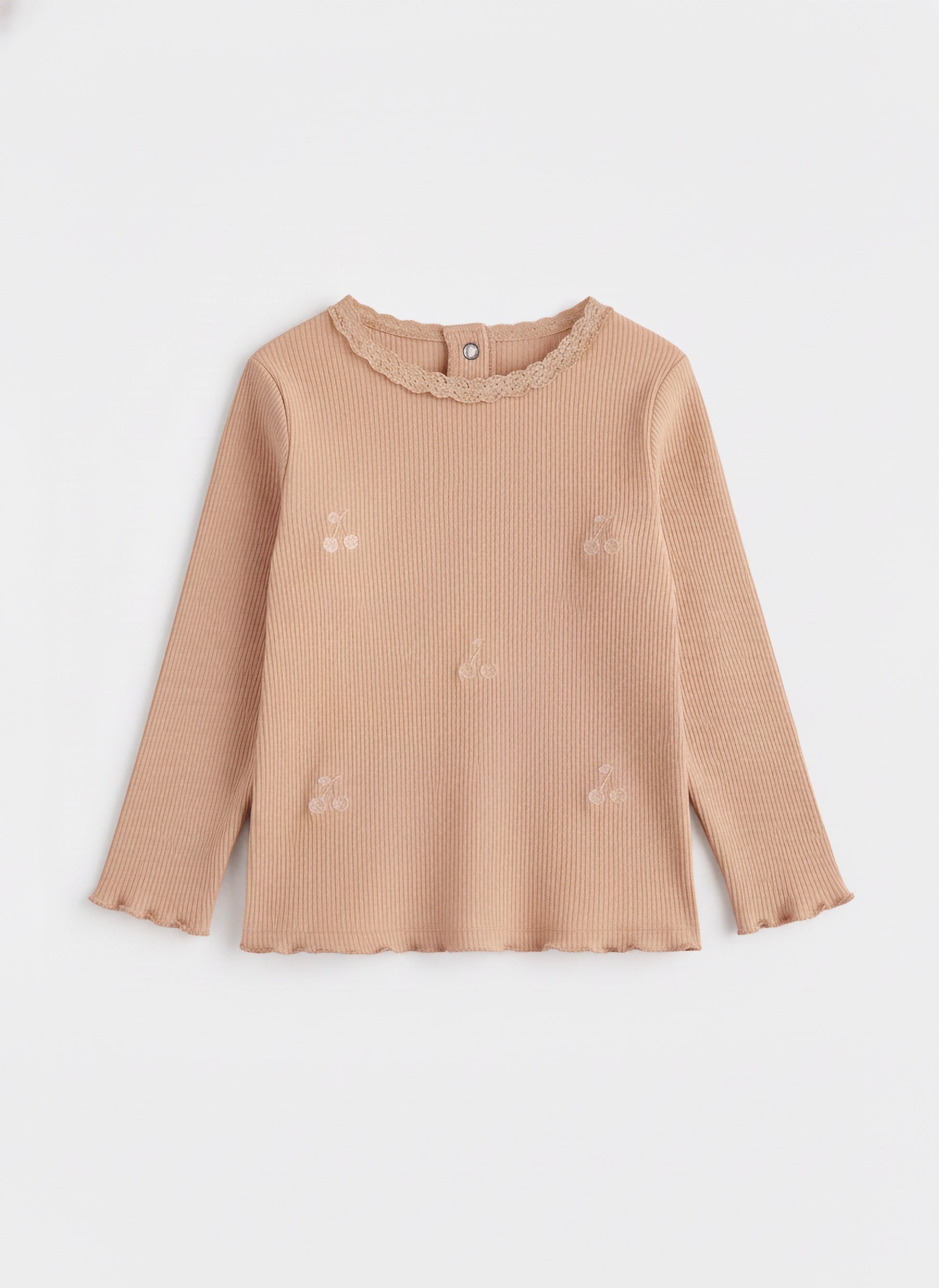 Wrap your baby in comfort and cuteness with this soft ribbed cotton tee. The gentle fabric feels cozy against delicate skin, while the sweet cherry embroidery adds a playful touch.
