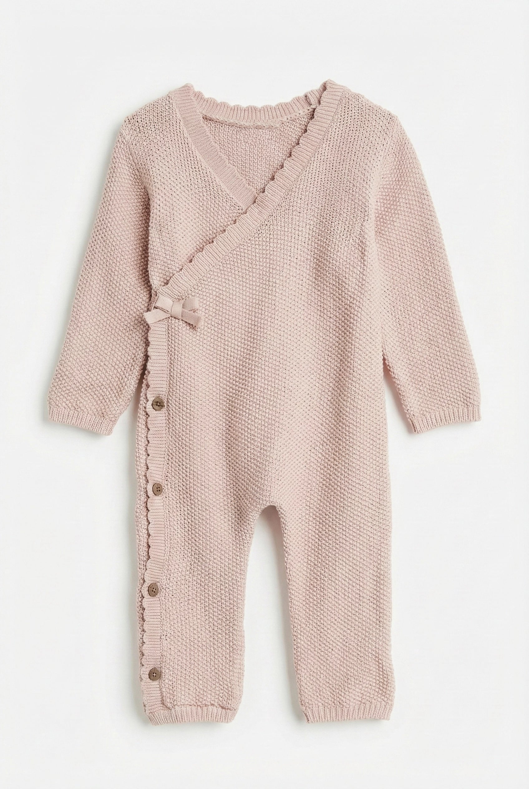 The romper features a lovely "seed stitch" texture that feels gentle against delicate skin, while the wrap-style front makes dressing fuss-free