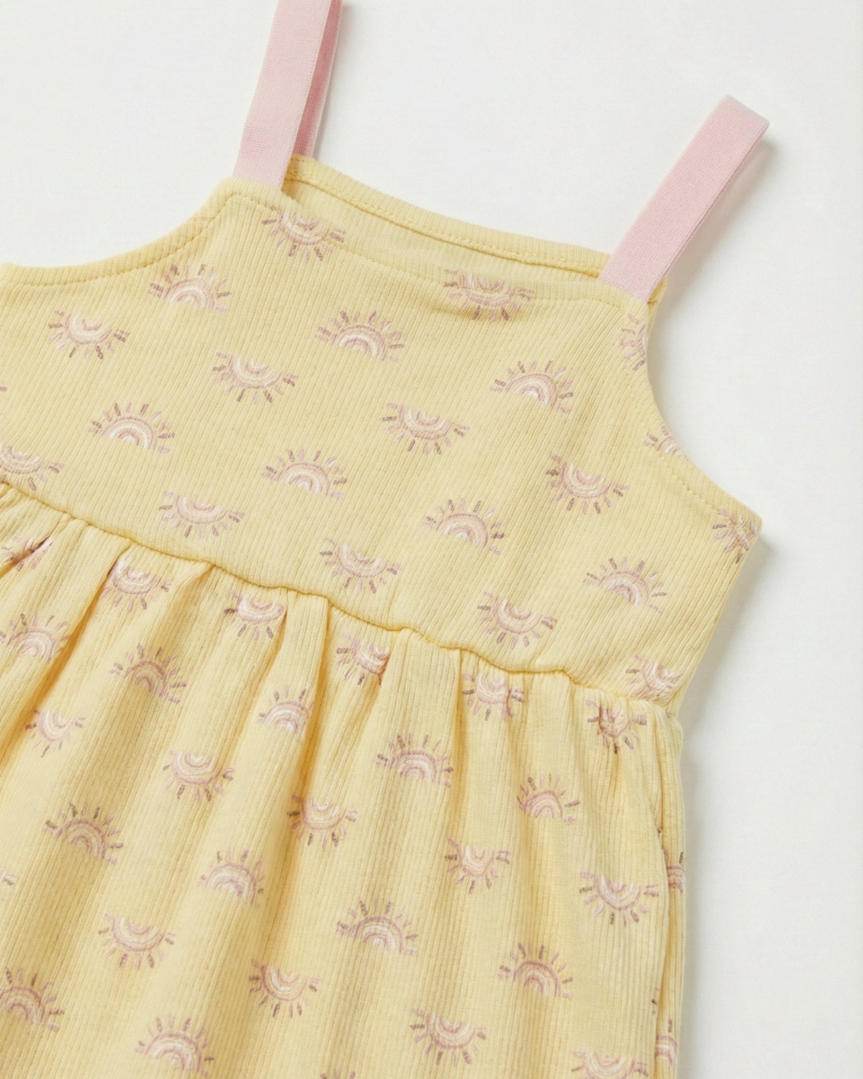 Featuring a sweet sun print, pink elastic straps, and crafted from 100% cotton for all-day comfort.