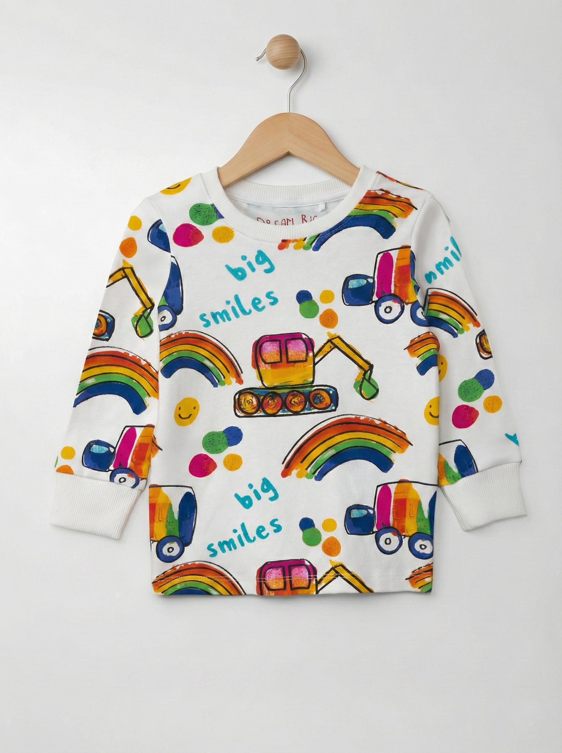 Bring color, joy, and endless imagination to your little one’s day with our Big Smiles full sleeve tee! Crafted from soft, breathable cotton, this adorable top features a lively mix of rainbow arcs, cheerful dots, and playful construction trucks.
