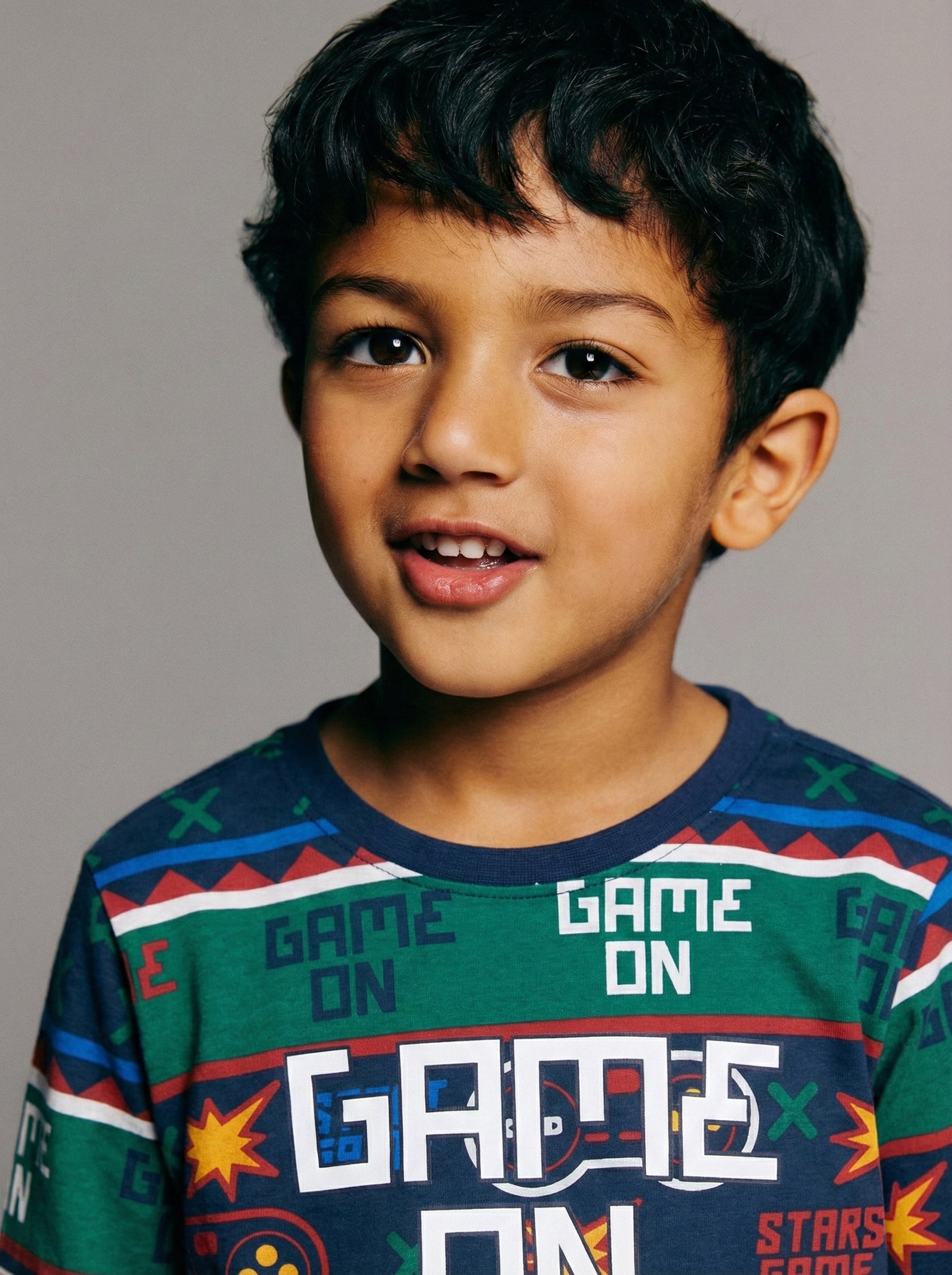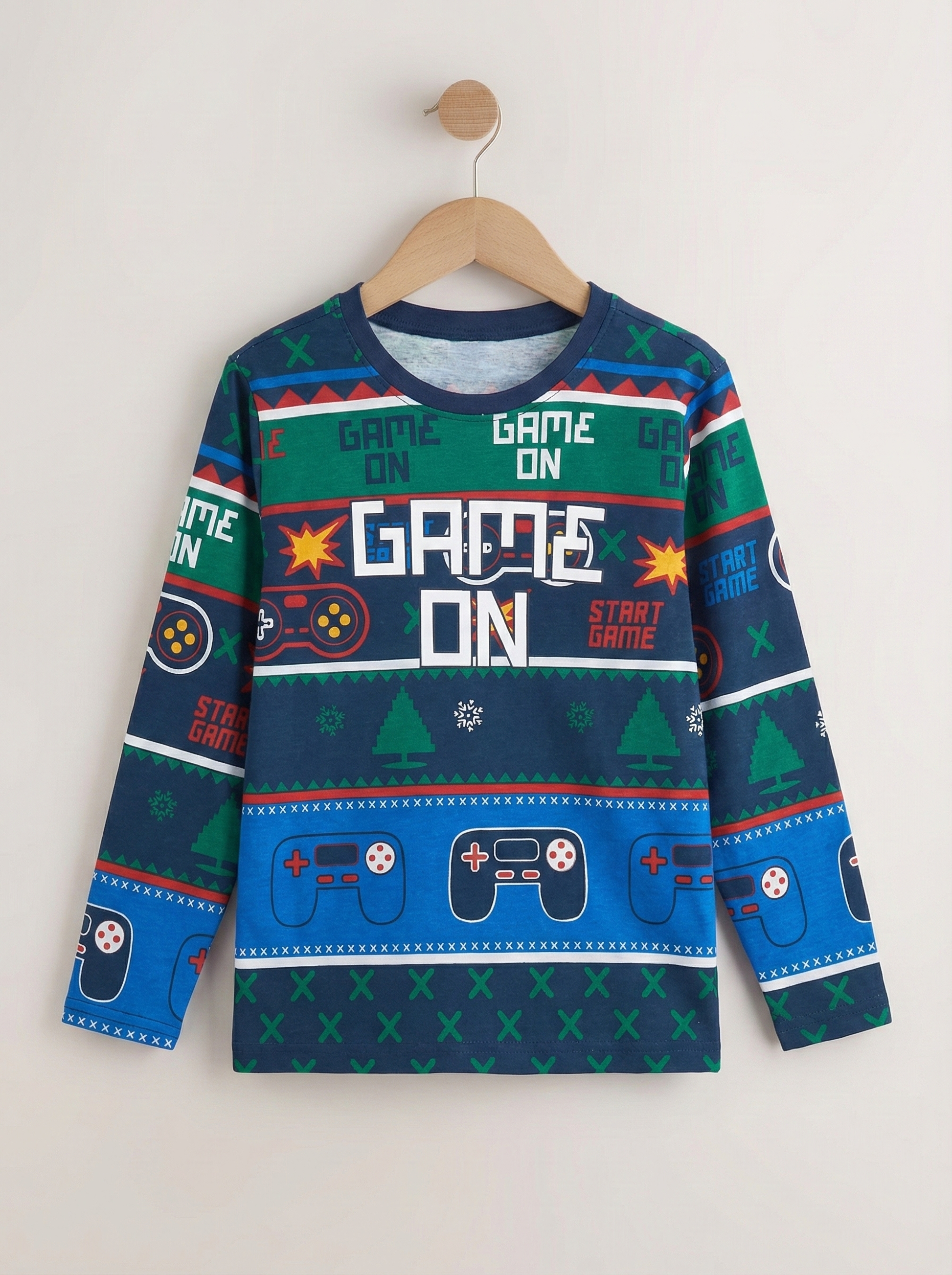 Level up your child's style with this vibrant Boys' Full Sleeve Gaming T-Shirt! Featuring an exciting "Game On" graphic print and colorful controller designs, this shirt is perfect for young gaming enthusiasts.