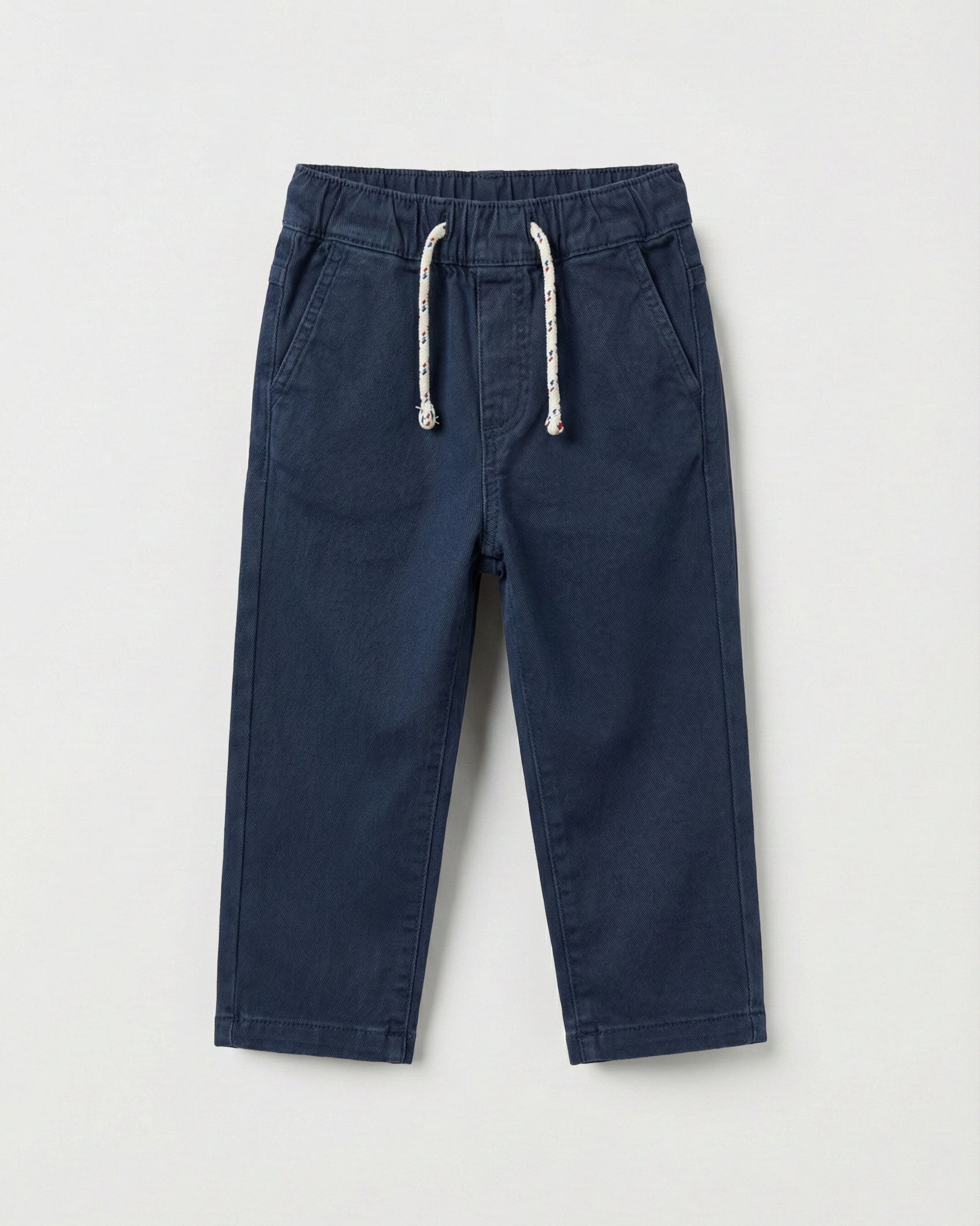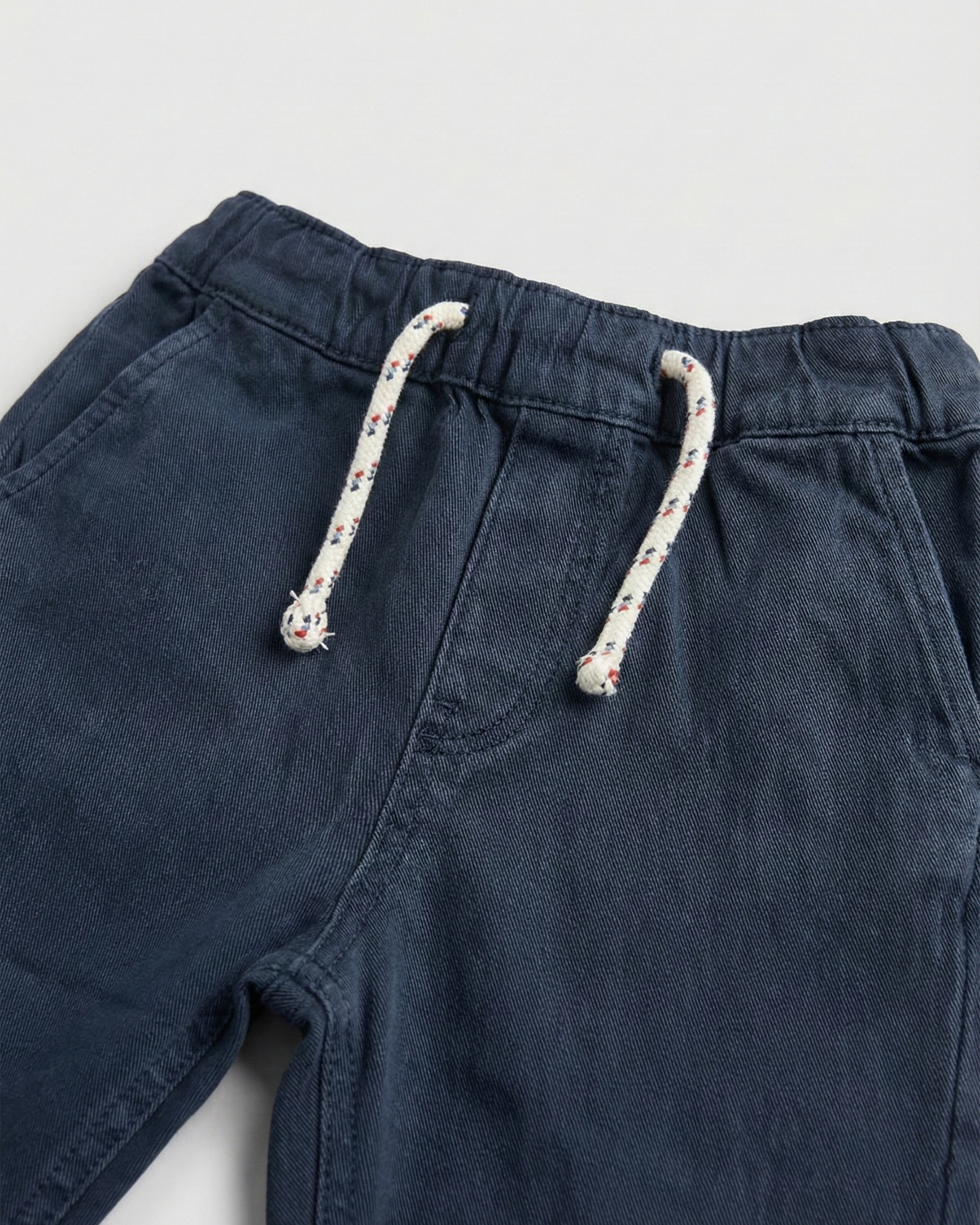 Shop our comfortable boys' navy blue cotton twill pants. Featuring an easy elastic waistband, a fun patterned drawstring, and durable fabric that is perfect for everyday.
