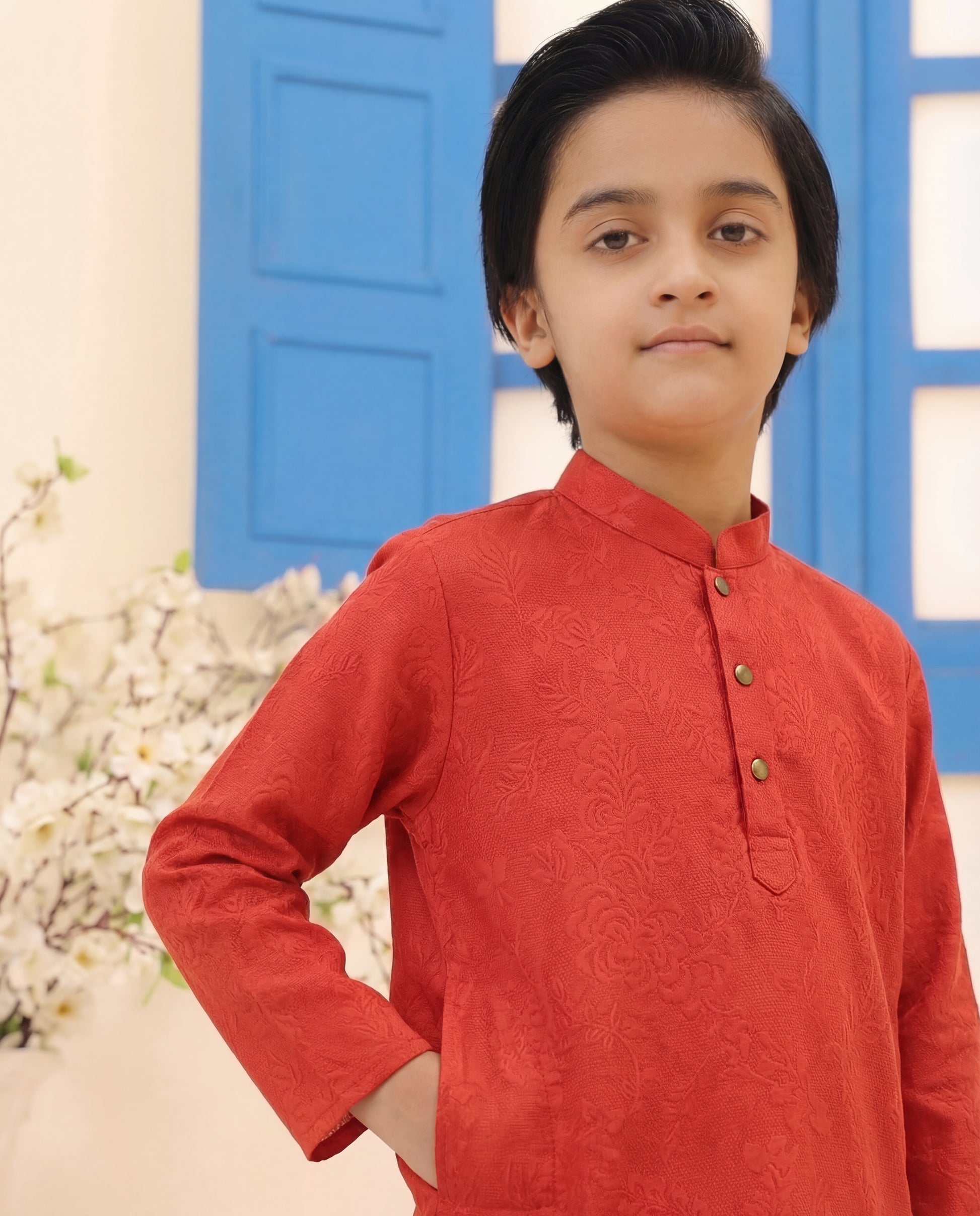 Dress your little one in timeless elegance with this striking red Panjabi and white pyjama set. This outfit is designed to make him stand out at any festive occasion, wedding, or cultural celebration.