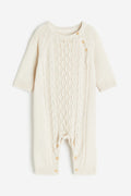 Soft cable-knit romper featuring an intricate braided pattern down the front. Designed with a round neckline and button closures at the shoulder seam, long sleeves, and a convenient button opening along the inseam finished with hem ribbed detailing at the cuffs and ankles.