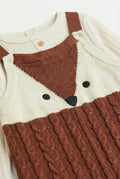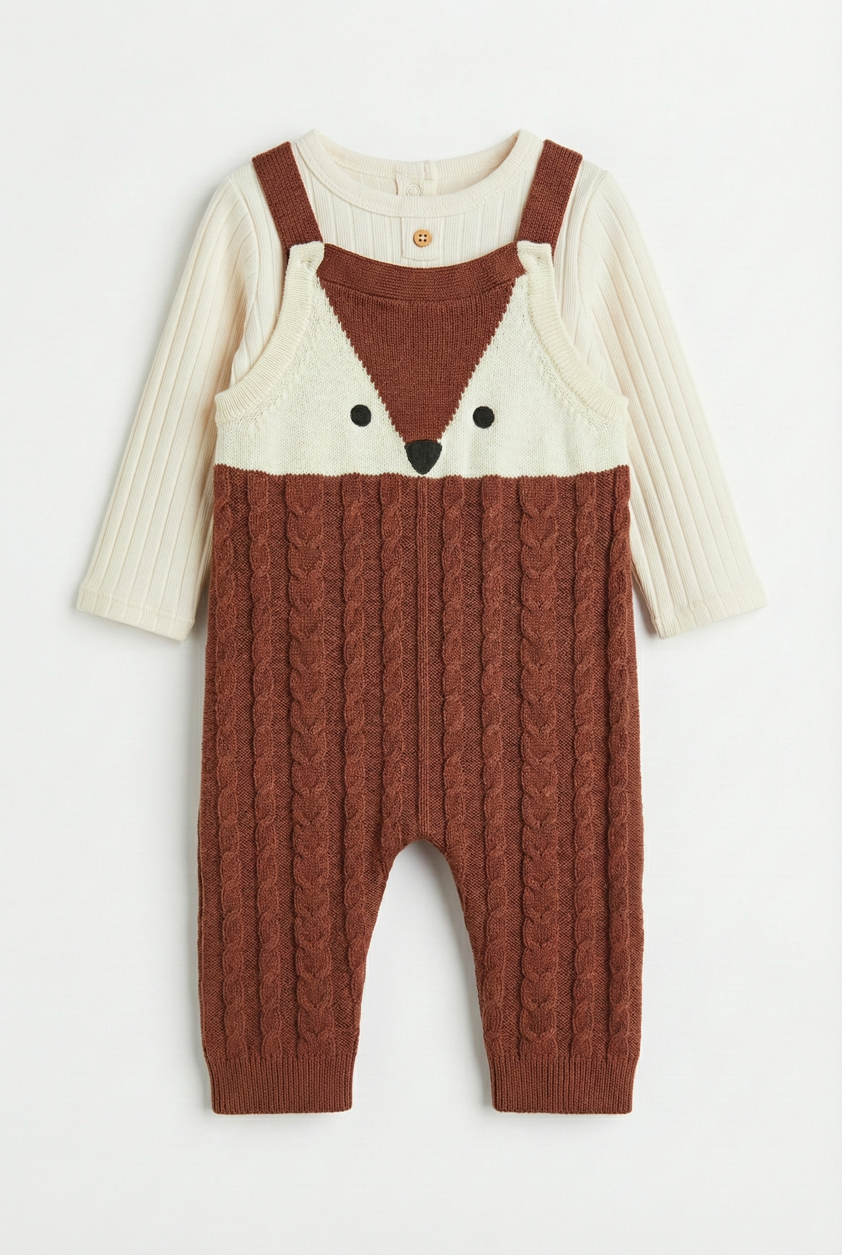 The set features a beautifully crafted pair of knitted overalls in a warm rust-brown tone, layered underneath is a versatile, long-sleeved bodysuit in a creamy off-white.