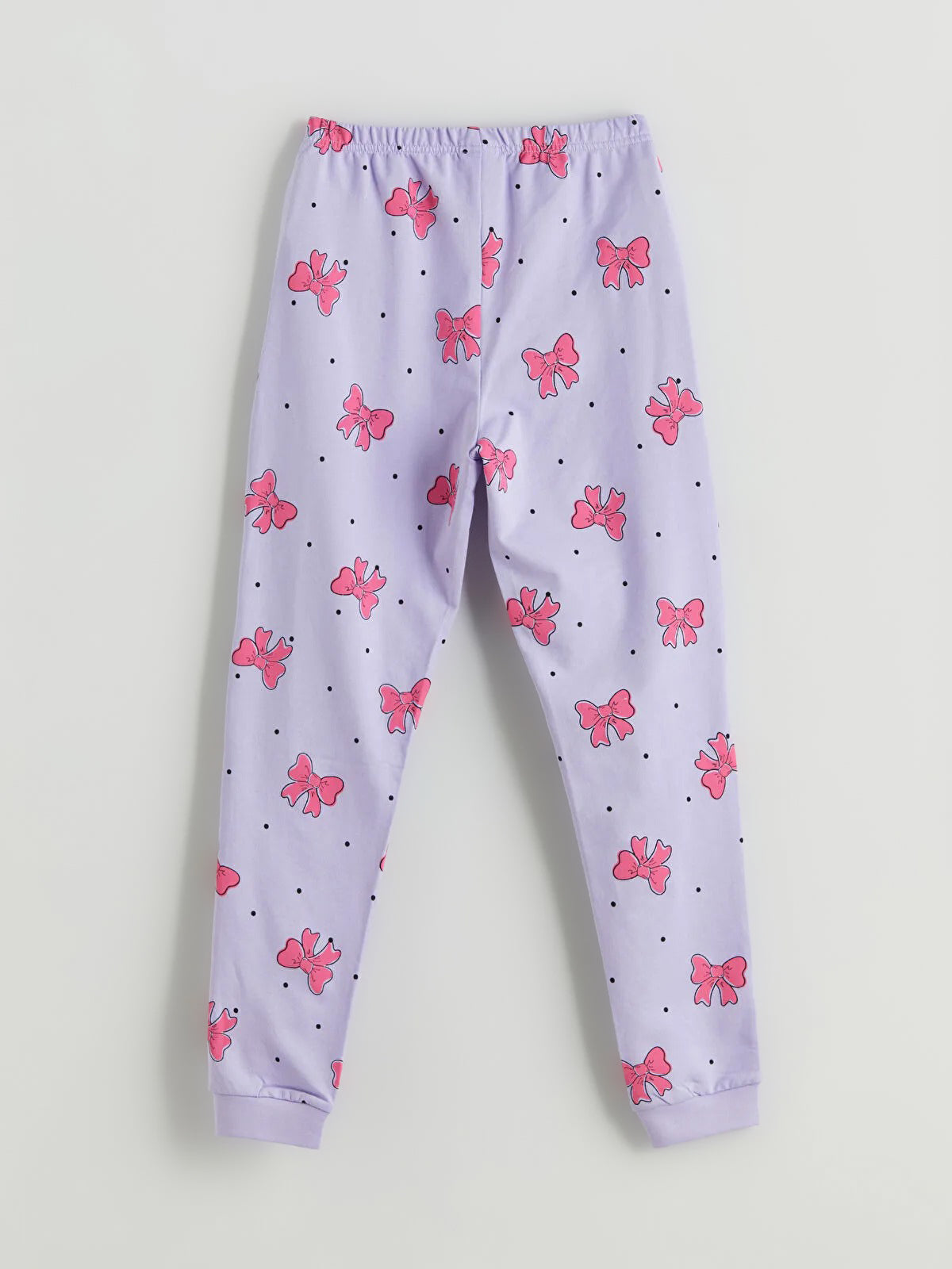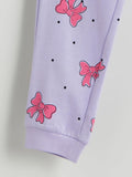 In a soft, dreamy lavender-purple, these sweatpants feature a fun all-over print of bright pink bows and tiny black polka dots.