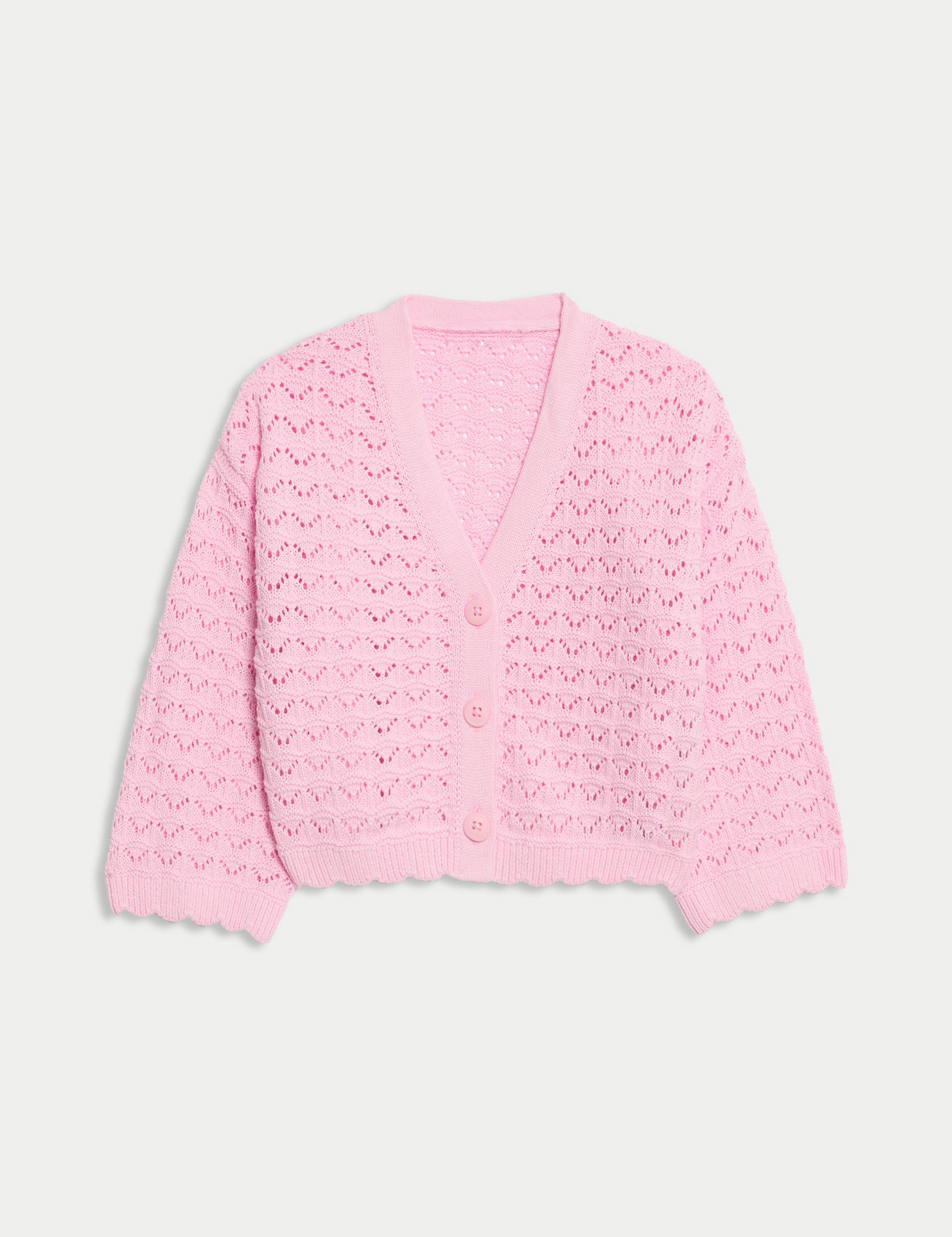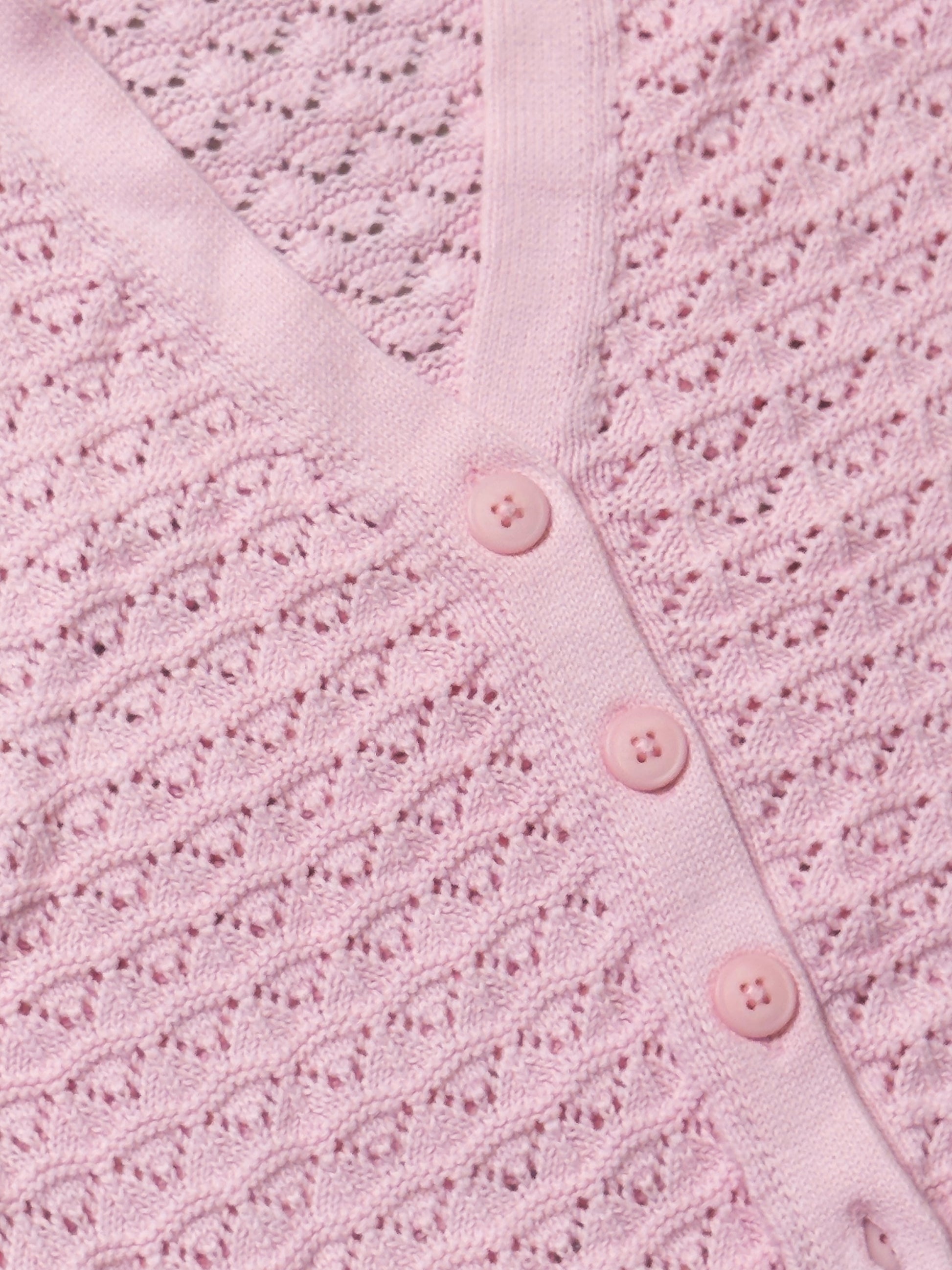 Introduce a pop of cheerful color and vintage charm to your little one’s closet with our Pink Crochet Cardigan.