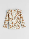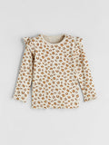 Girl's Ruffled Shoulder Ribbed Cotton Full Sleeve T-shirt | Beige