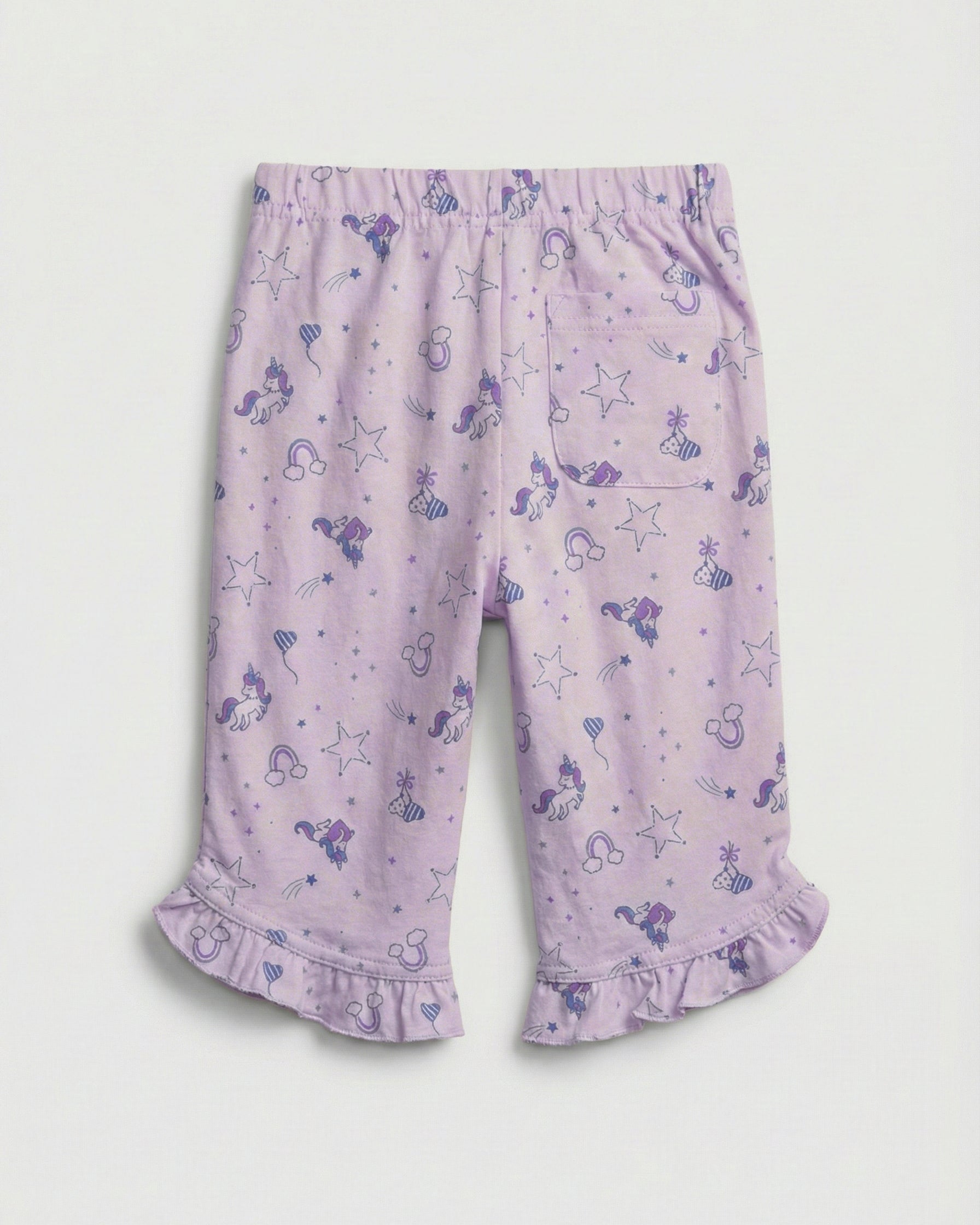 Let her imagination soar in these 100% cotton purple unicorn cropped leggings. Super soft, breathable, and finished with sweet ruffle hems for all-day play.