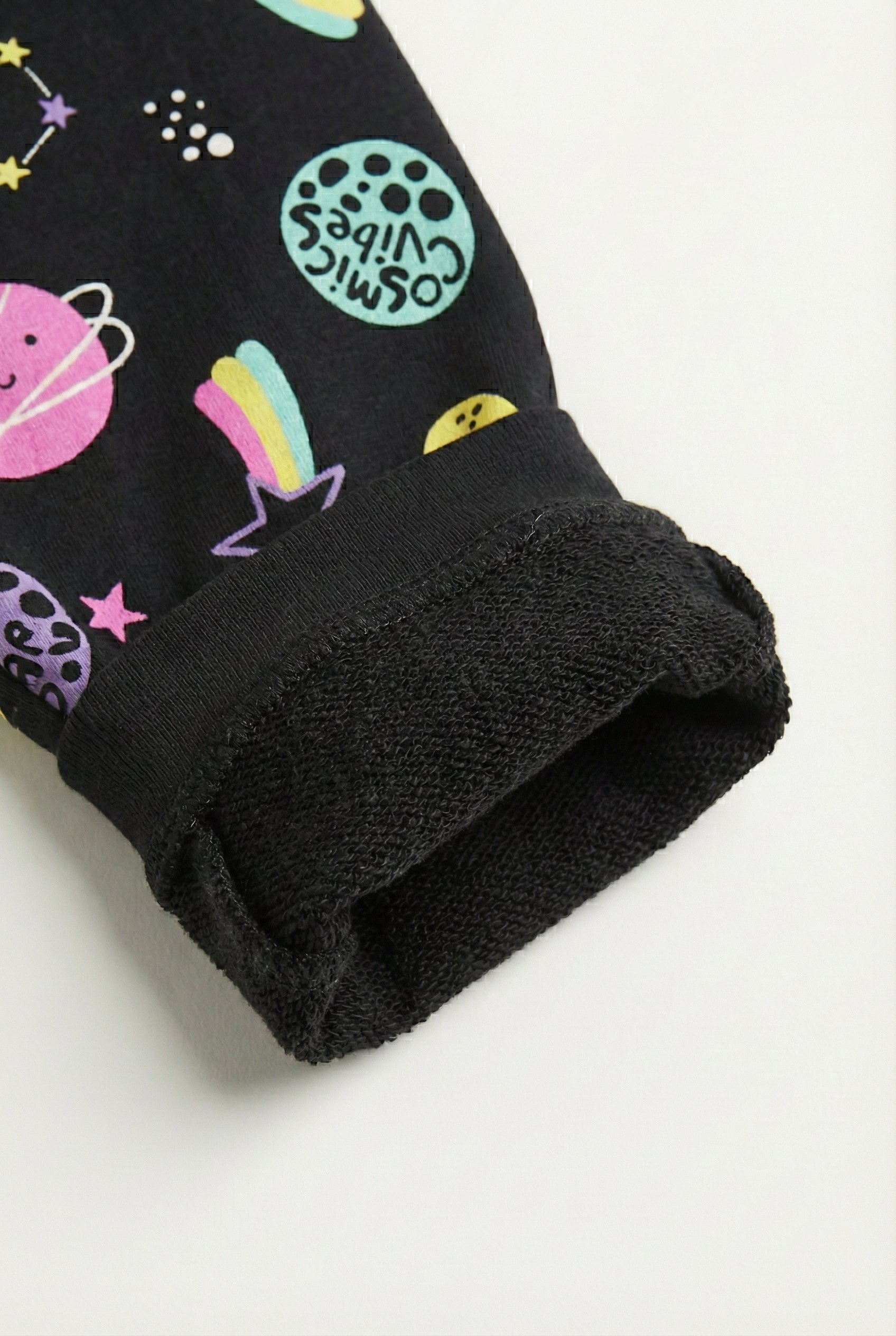 Blast off into comfort! These girls' black leggings feature a vibrant space print and a cozy French Terry inner lining. Soft, stretchy, and perfect for everyday adventures.