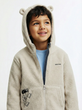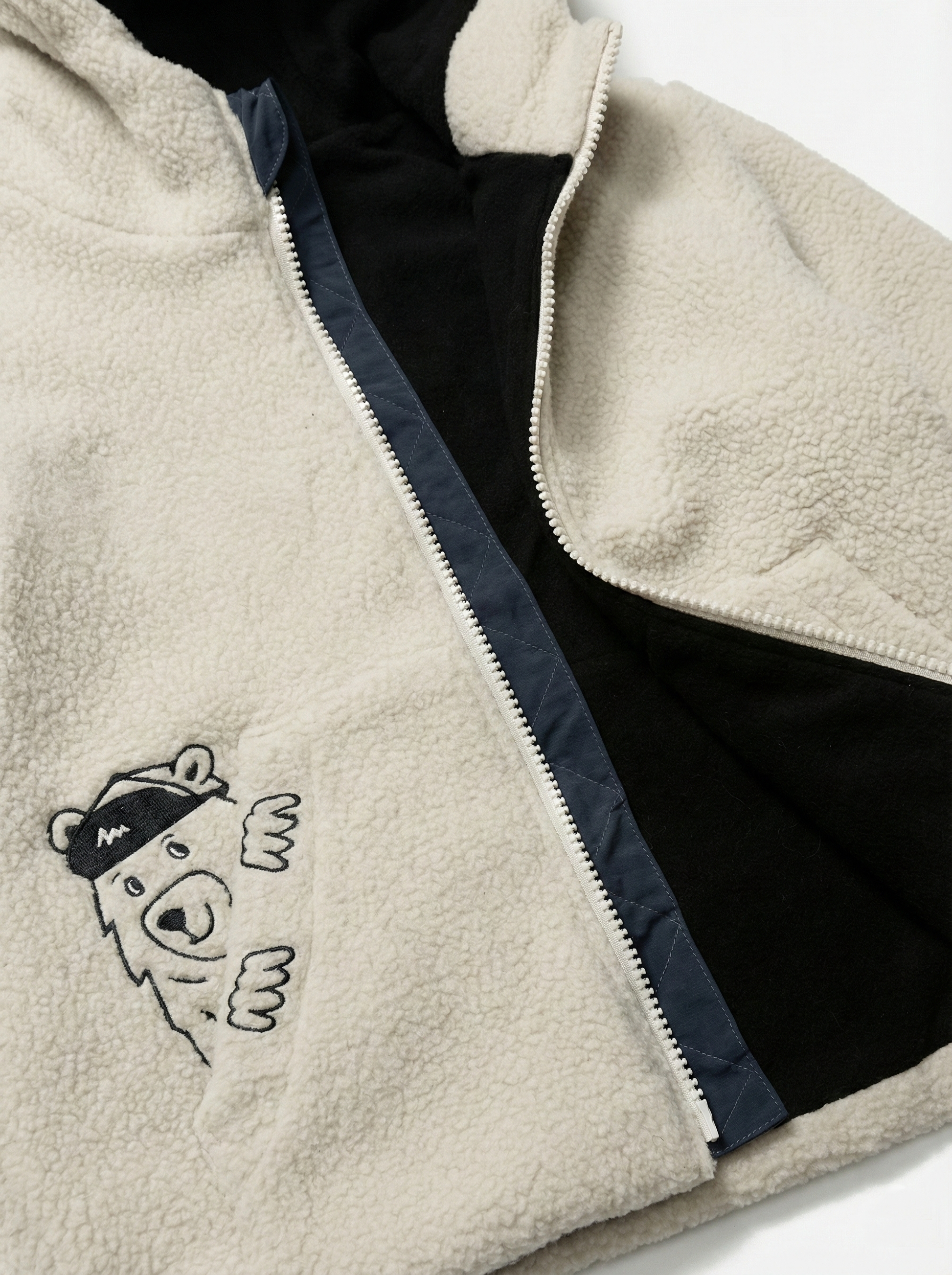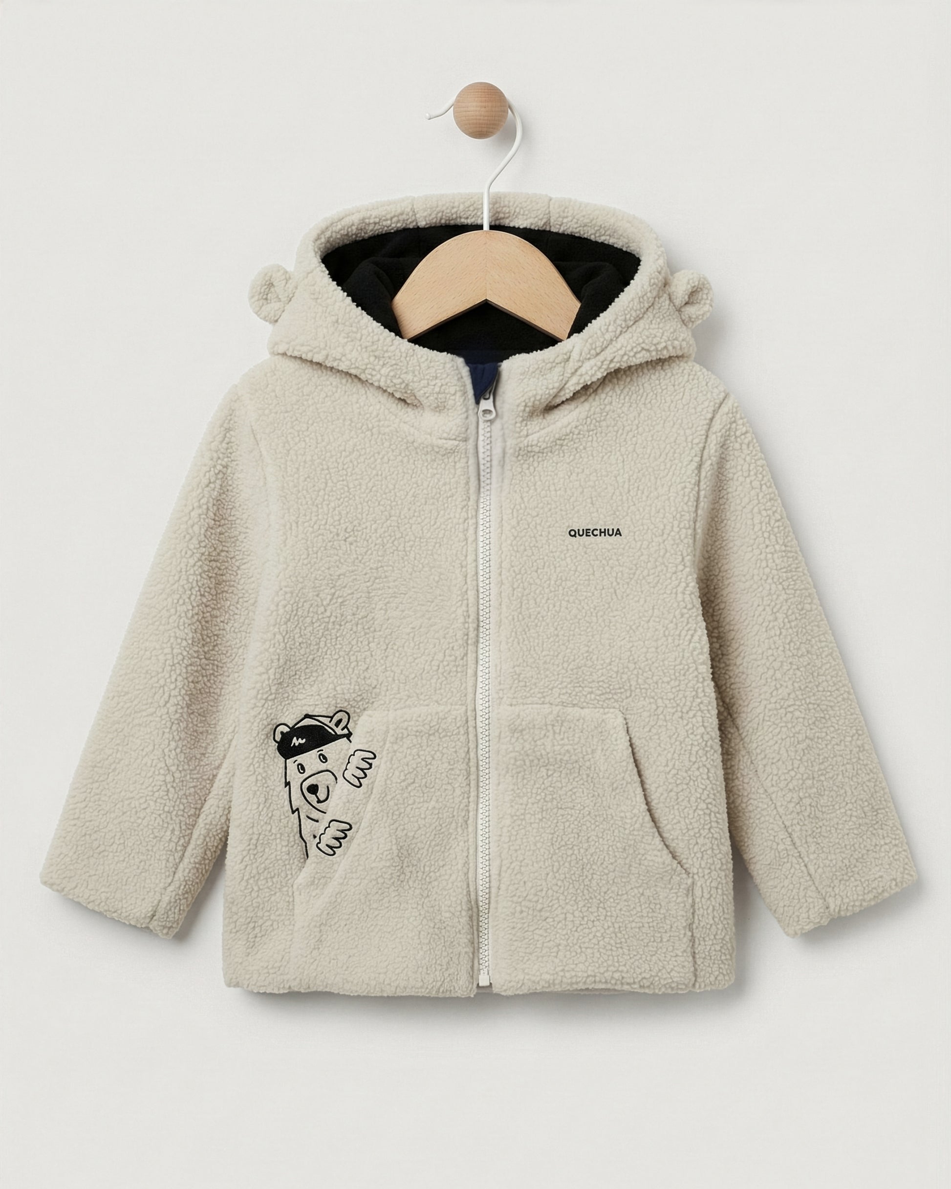 Crafted from high-quality, textured sherpa fleece, it offers exceptional insulation against the cold. The standout feature is the hood, complete with adorable 3D bear ears that add a touch of whimsy to every wear.