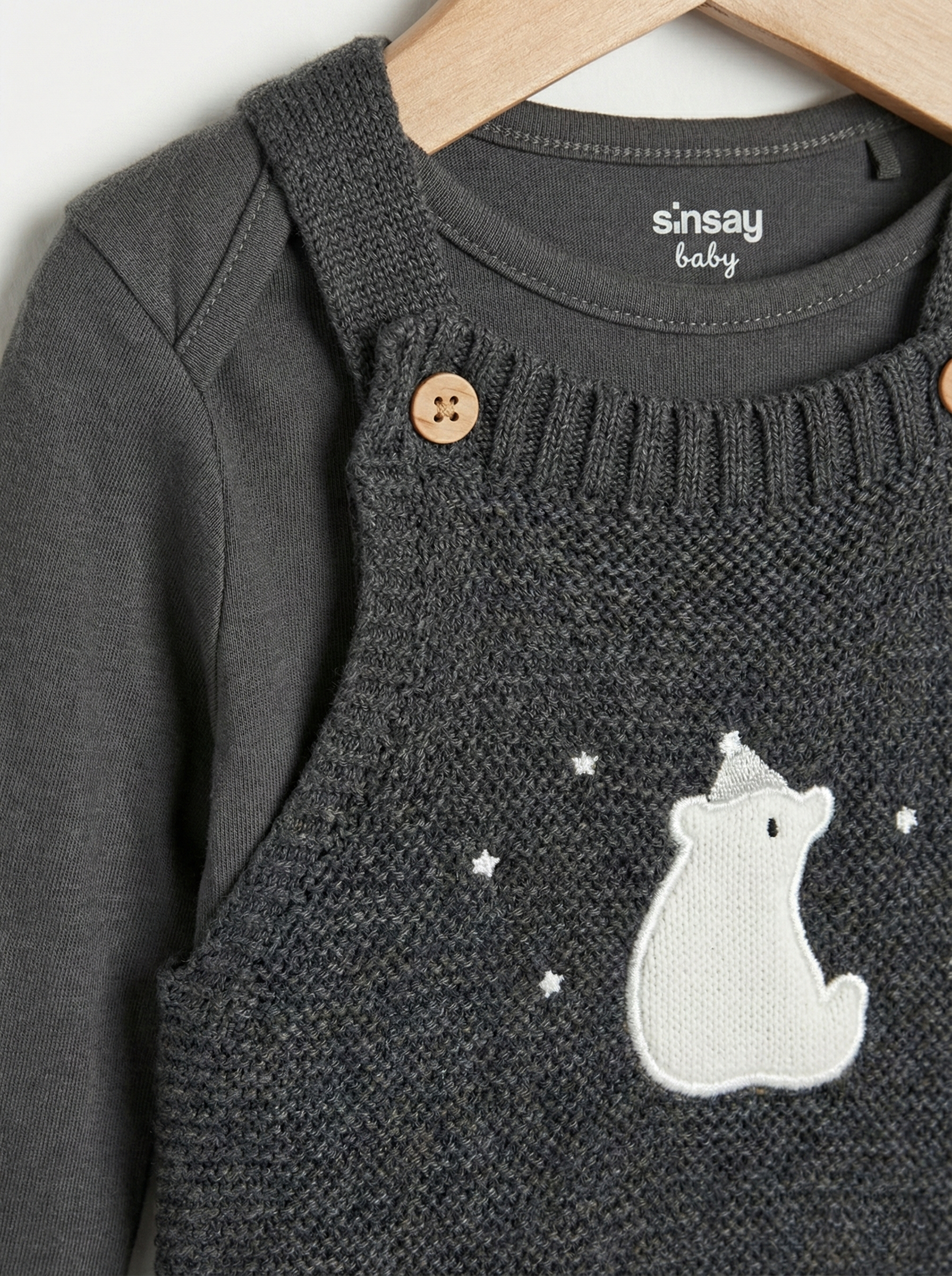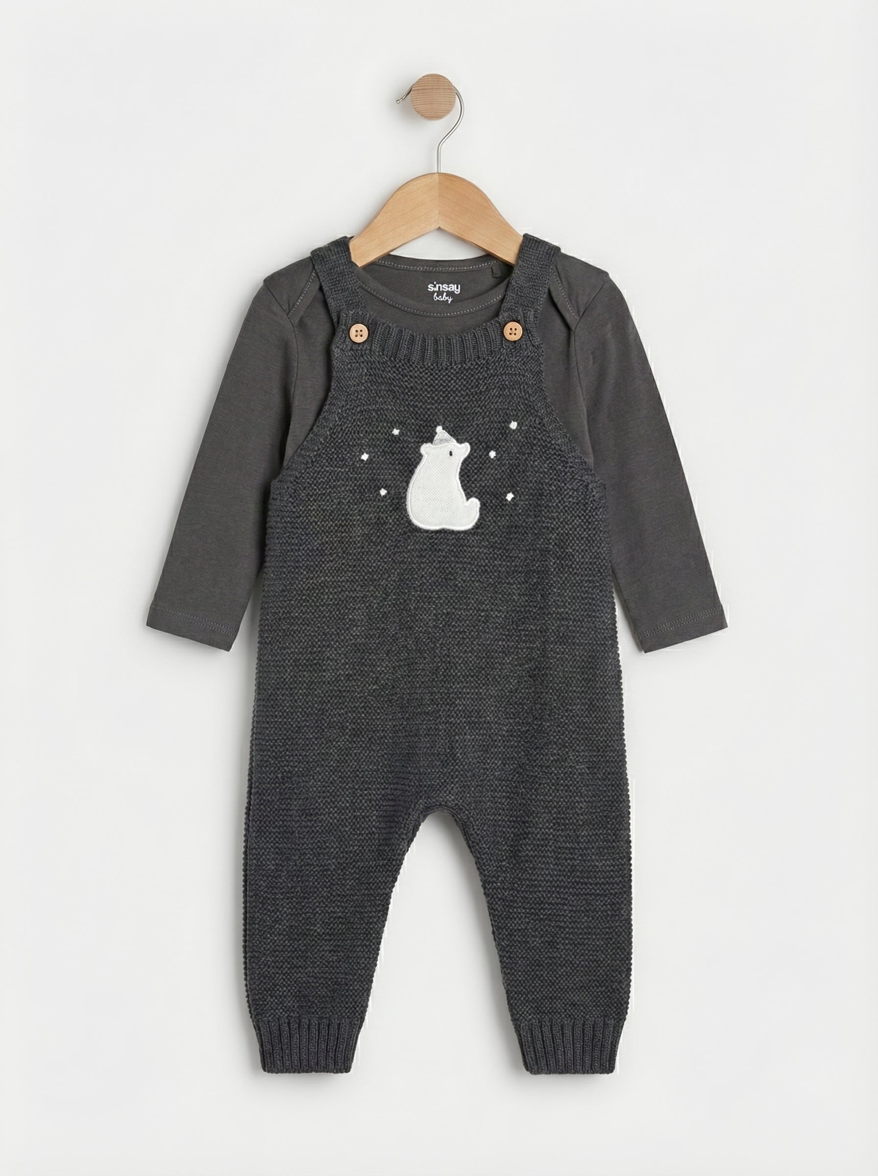 Get your little one ready for chilly adventures with this ultra-cozy knit dungaree set. This charming outfit features a textured, charcoal grey knit overall adorned with a sweet white polar bear and starry night design on the chest.