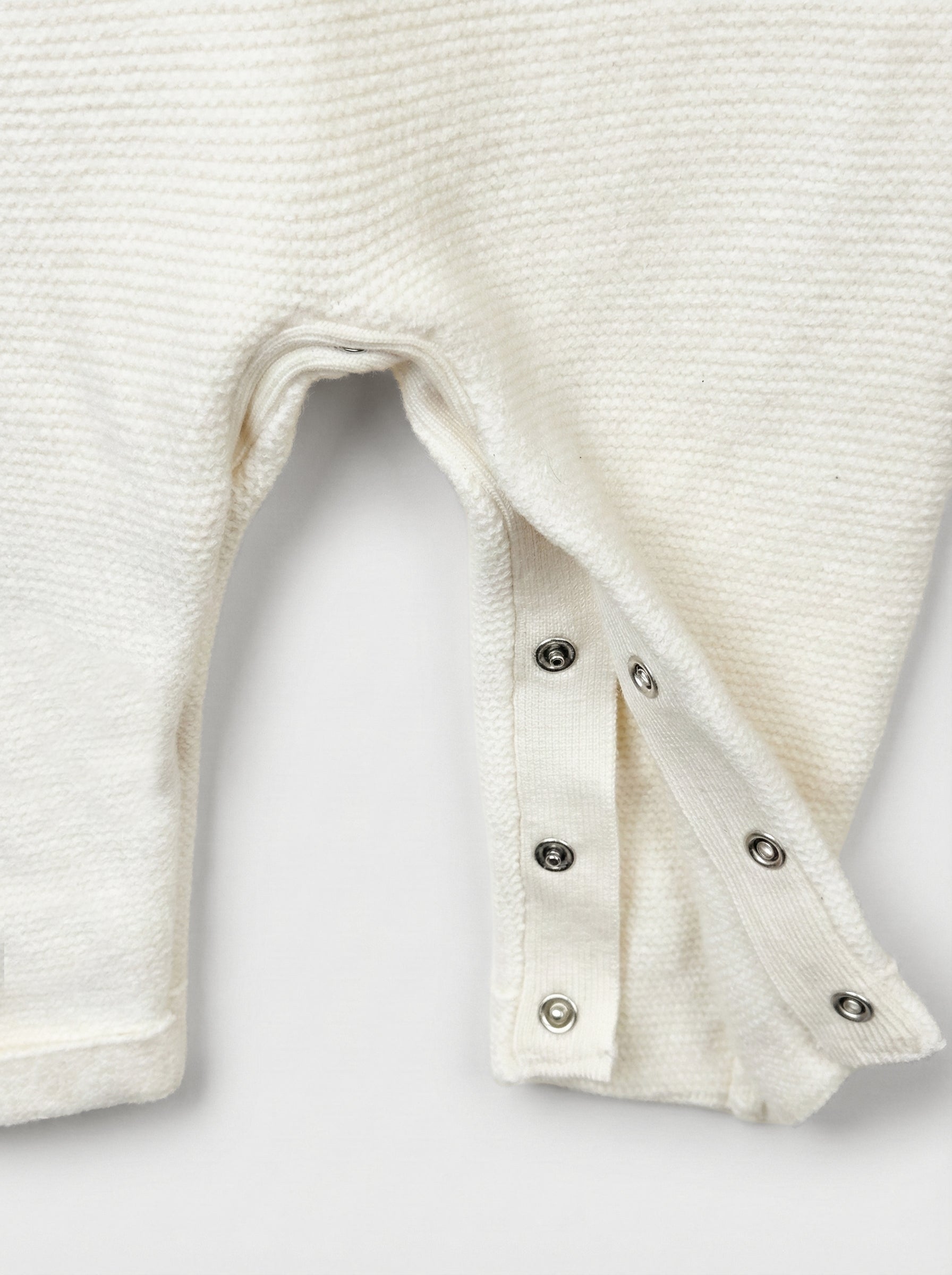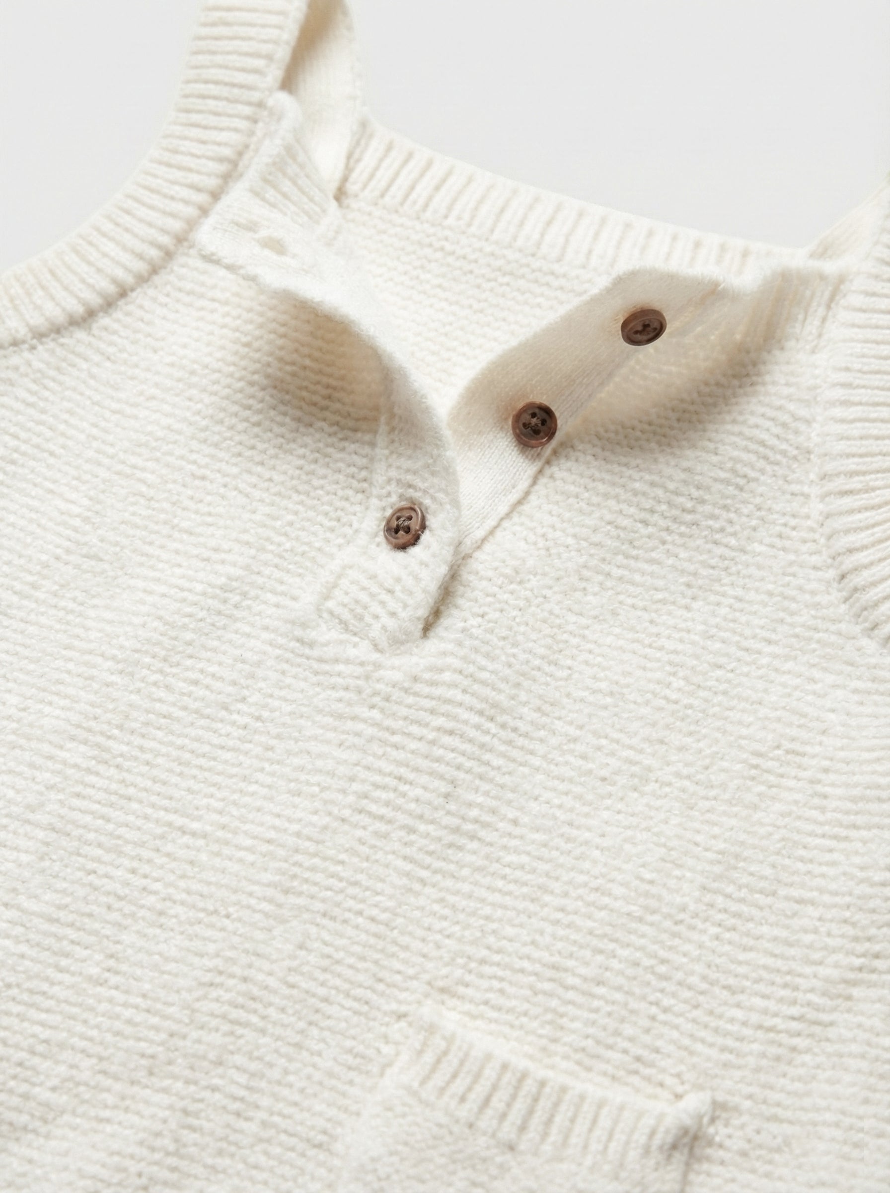 Soft, stylish, and oh-so-cozy, this cream-white knit romper is a timeless piece for your little one’s wardrobe. Designed with comfort and convenience in mind, it features a sleeveless cut, three wooden-look buttons at the front for easy dressing, and a charming mini pocket detail for a sweet touch.