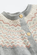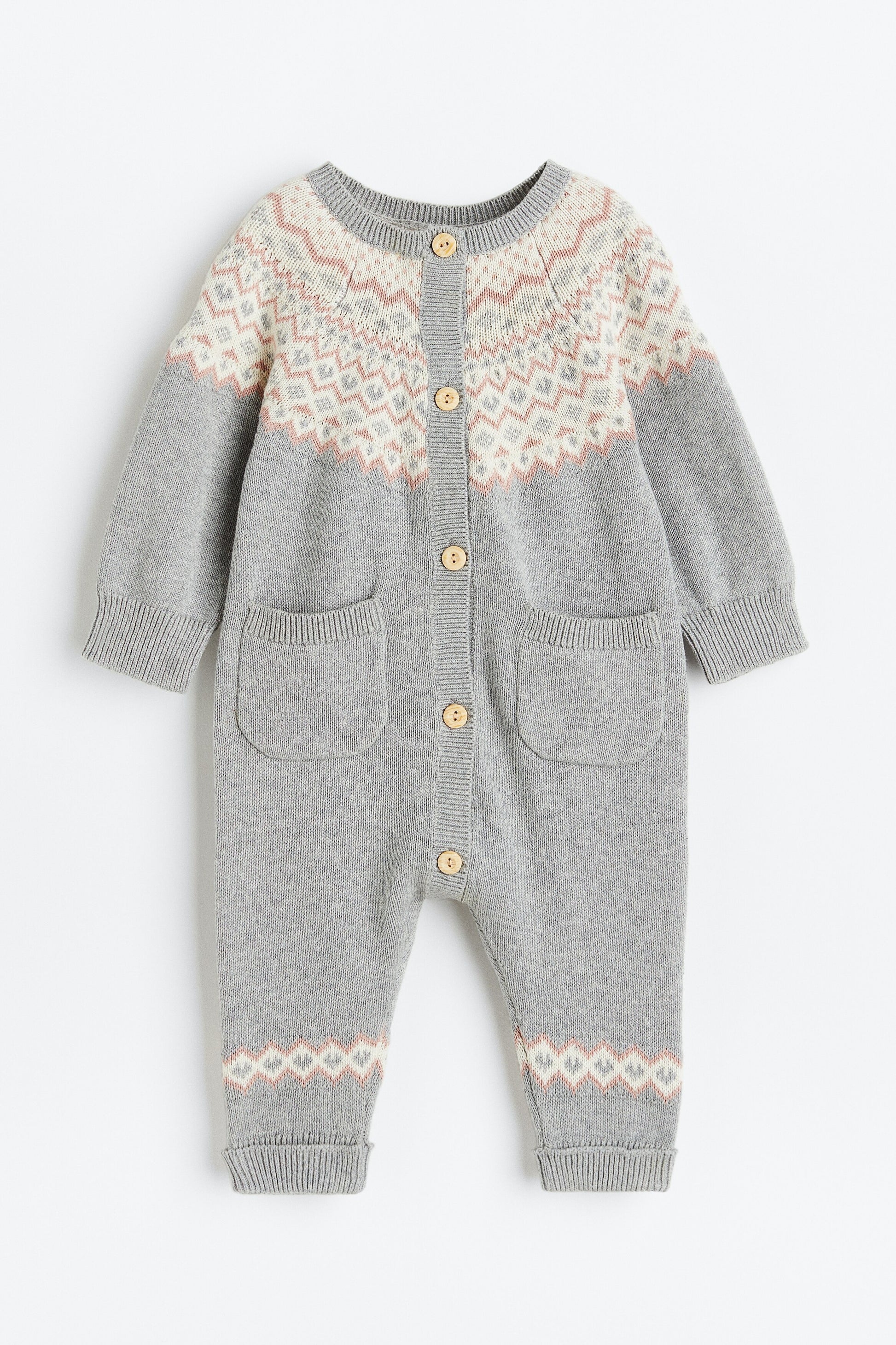 Soft cotton knit onesie featuring a full button-down front. Designed with a round neckline and ribbed trim, long sleeves, and open front pockets finished with ribbed detailing.