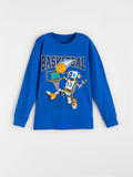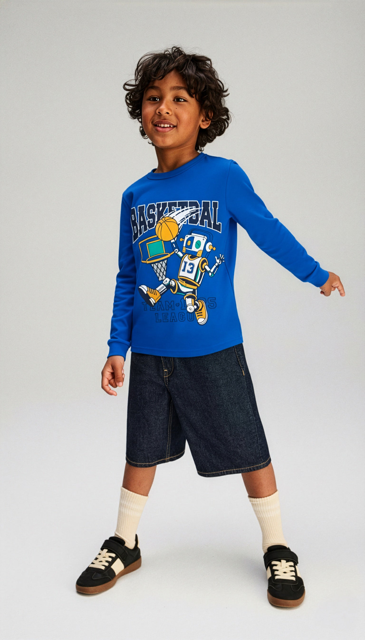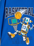 Get ready to score big in style with this awesome long-sleeve cotton T-shirt! Designed for little sports and tech fans, this bright blue tee features a bold graphic of a retro-style robot making an epic slam dunk.