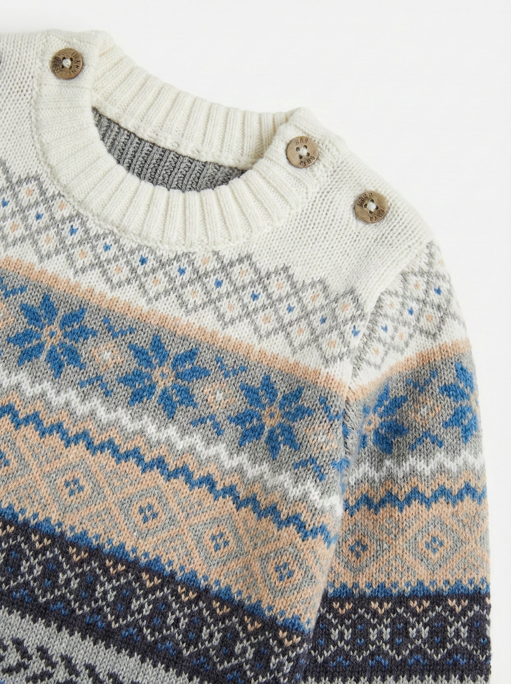 The romper features a beautifully intricate Fair Isle pattern across the chest and shoulders, blending soft blues, warm tans, and deep charcoal against a creamy white yoke.