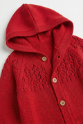 The design features a beautiful, intricate pointelle knit pattern across the yoke and down the sleeves, adding a touch of delicate detail. A cozy hood with a garter stitch brim provides extra warmth for little ears.