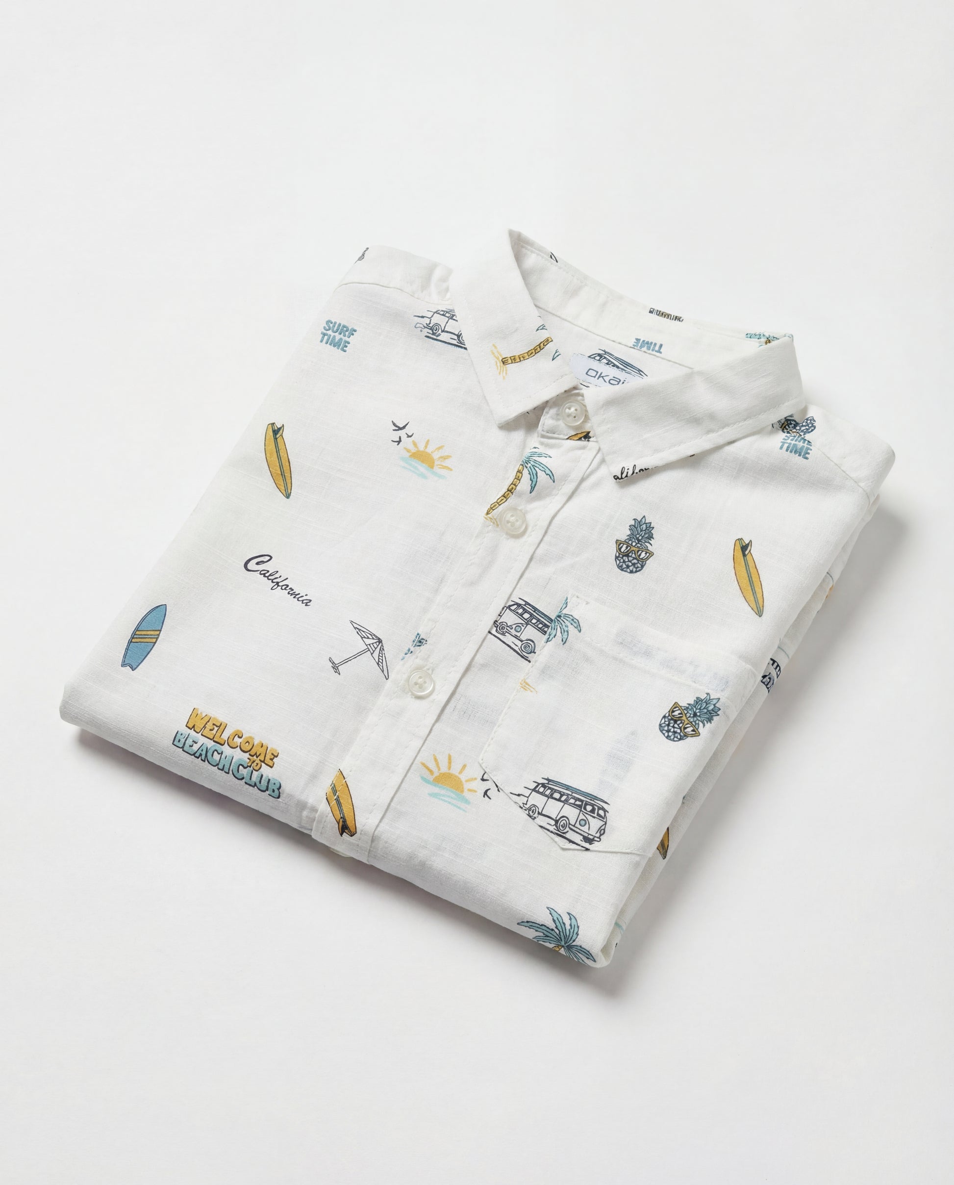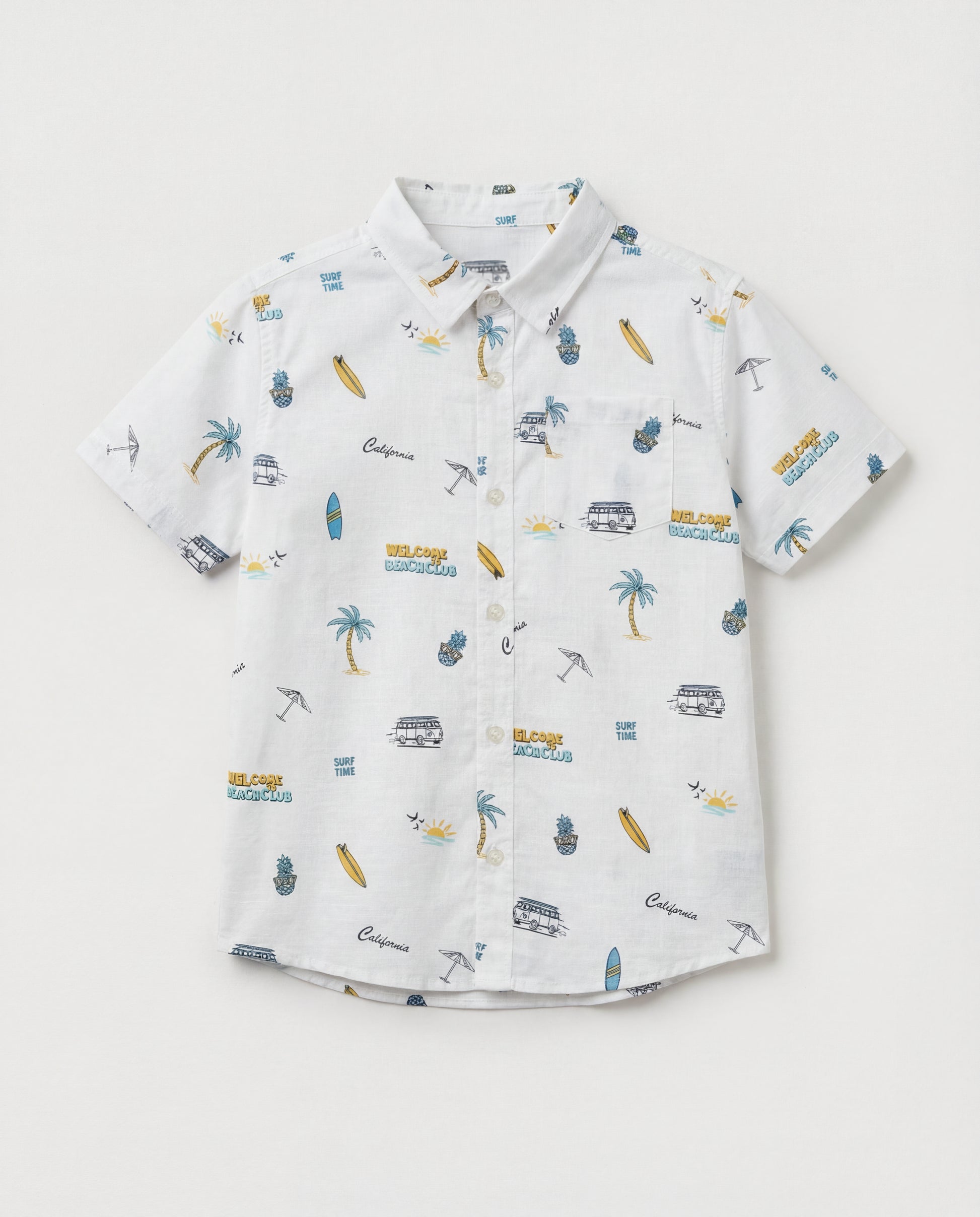 Featuring a playful all-over print of surfboards, palm trees, and vintage beach vans, this shirt is perfect for little explorers ready for a day at the coast or a casual weekend outing.