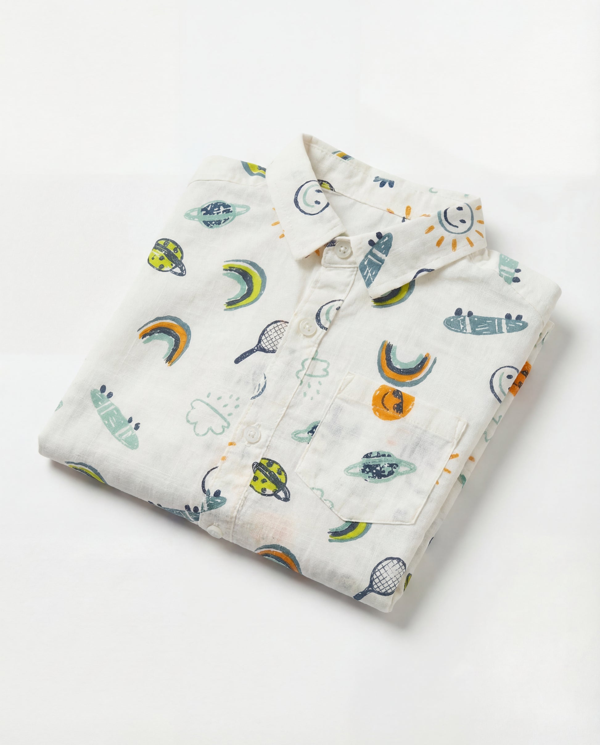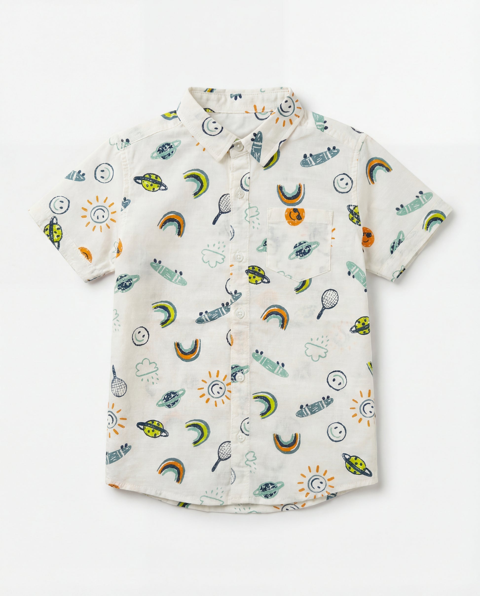 Featuring a delightful all-over "doodle" print with smiley suns, colourful rainbows, skateboards, and space elements, this shirt is designed for little ones who love to explore and play.
