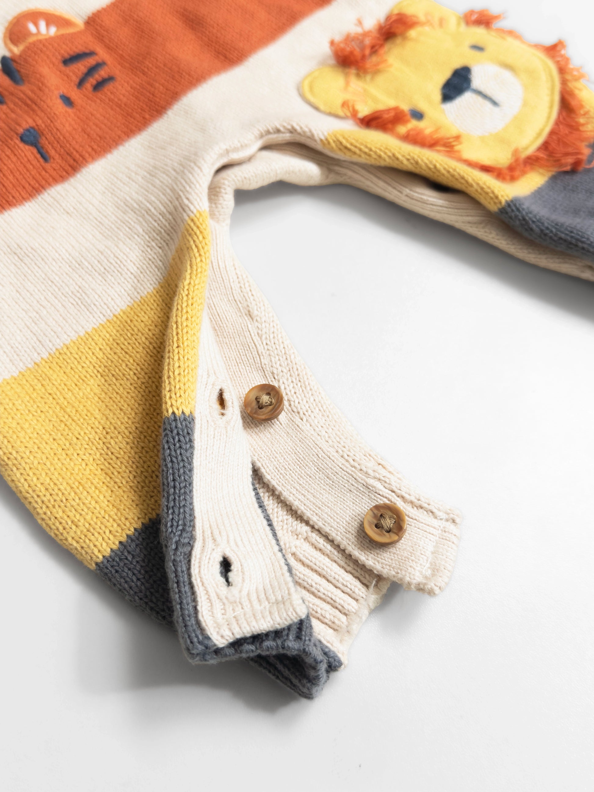 Ready for a Wild Adventure? Bring the zoo to your baby’s wardrobe with this adorable color-block knitted romper.