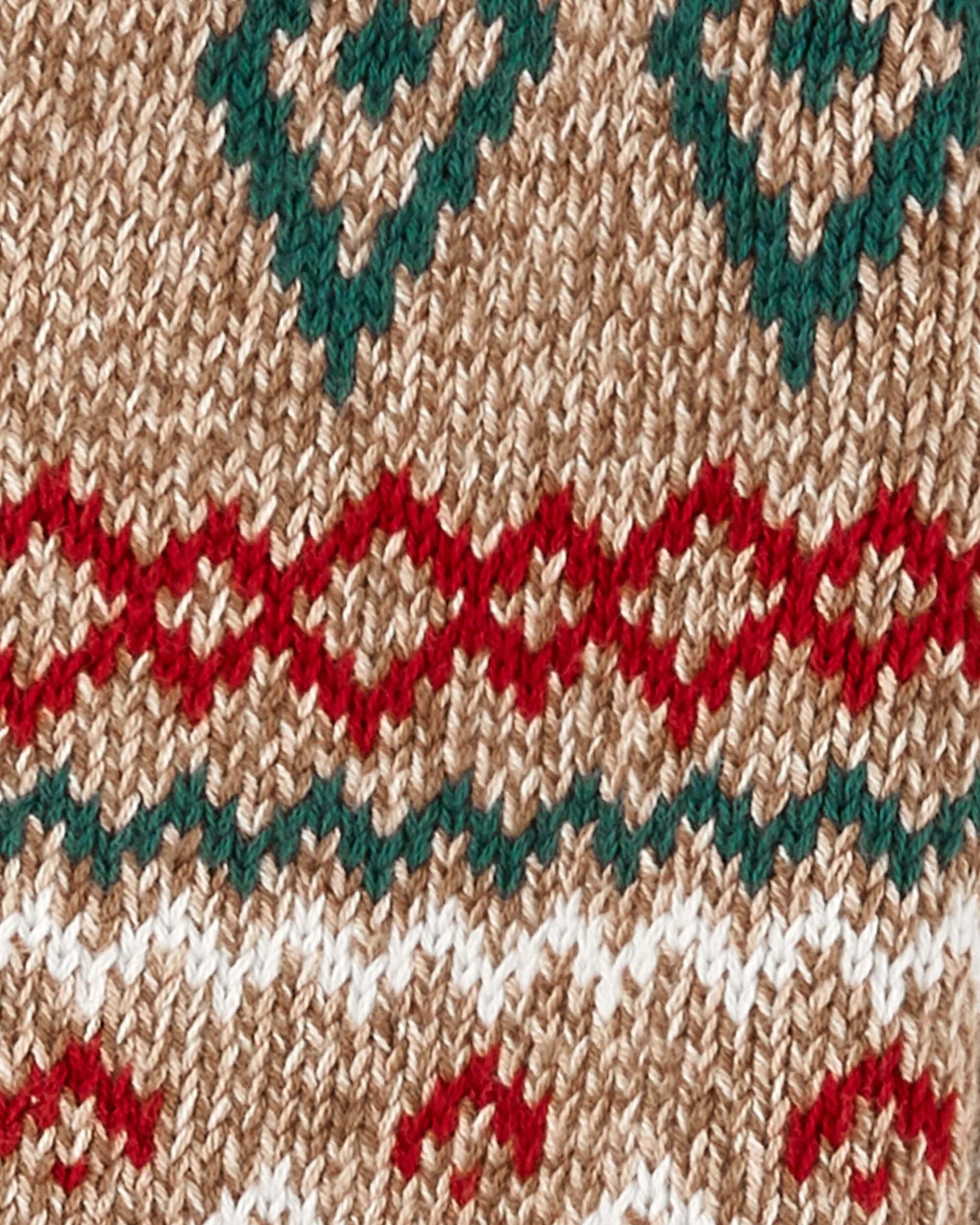 Soft knit romper featuring a full button-down front. Designed with a cozy shawl collar and ribbed trim, long sleeves, and a festive geometric Fair Isle pattern finished with wood-tone buttons.