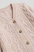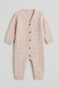 Wrap your little one in pure comfort with this blush pink cotton romper. It features a classic cable-knit texture, a cozy V-neckline, and natural wood-style buttons for easy dressing.
