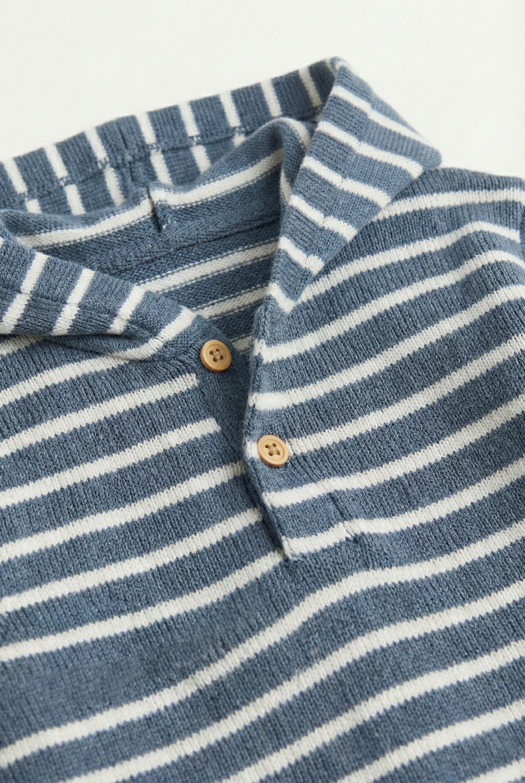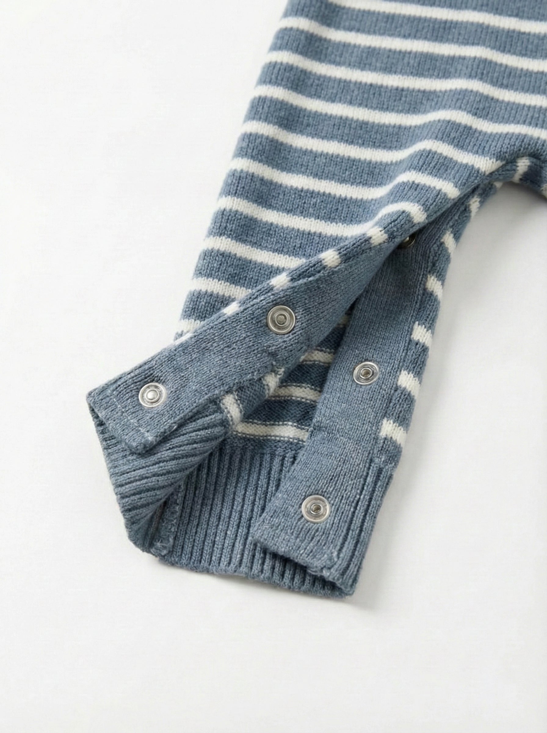 This romper features a timeless horizontal stripe pattern in soft denim blue and creamy white. It is made from a soft, stretchy knit fabric designed to be gentle on delicate skin.