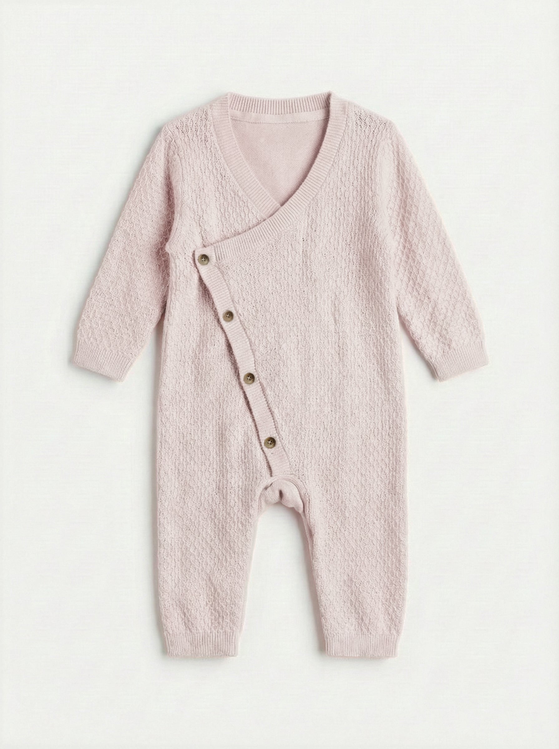The romper features a beautiful honeycomb textured knit that feels soft against delicate skin while providing just the right amount of warmth for breezy days or air-conditioned naps.