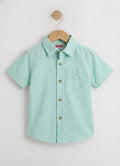 This short sleeve toddler boys shirt features a solid mint green color with a front chest pocket and button-down design for a clean, polished look.