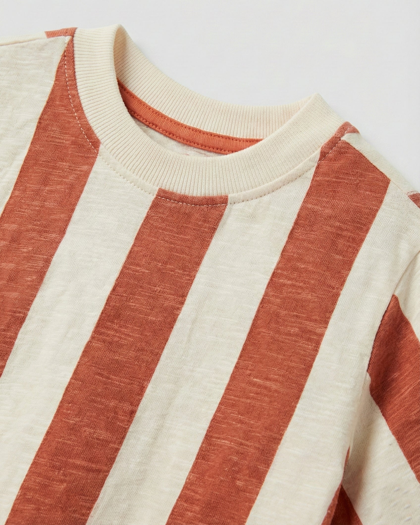 Featuring bold rust and cream vertical stripes, it adds a playful yet modern touch to your little one’s wardrobe. Crafted from soft, breathable cotton, it keeps your toddler comfy all day long.