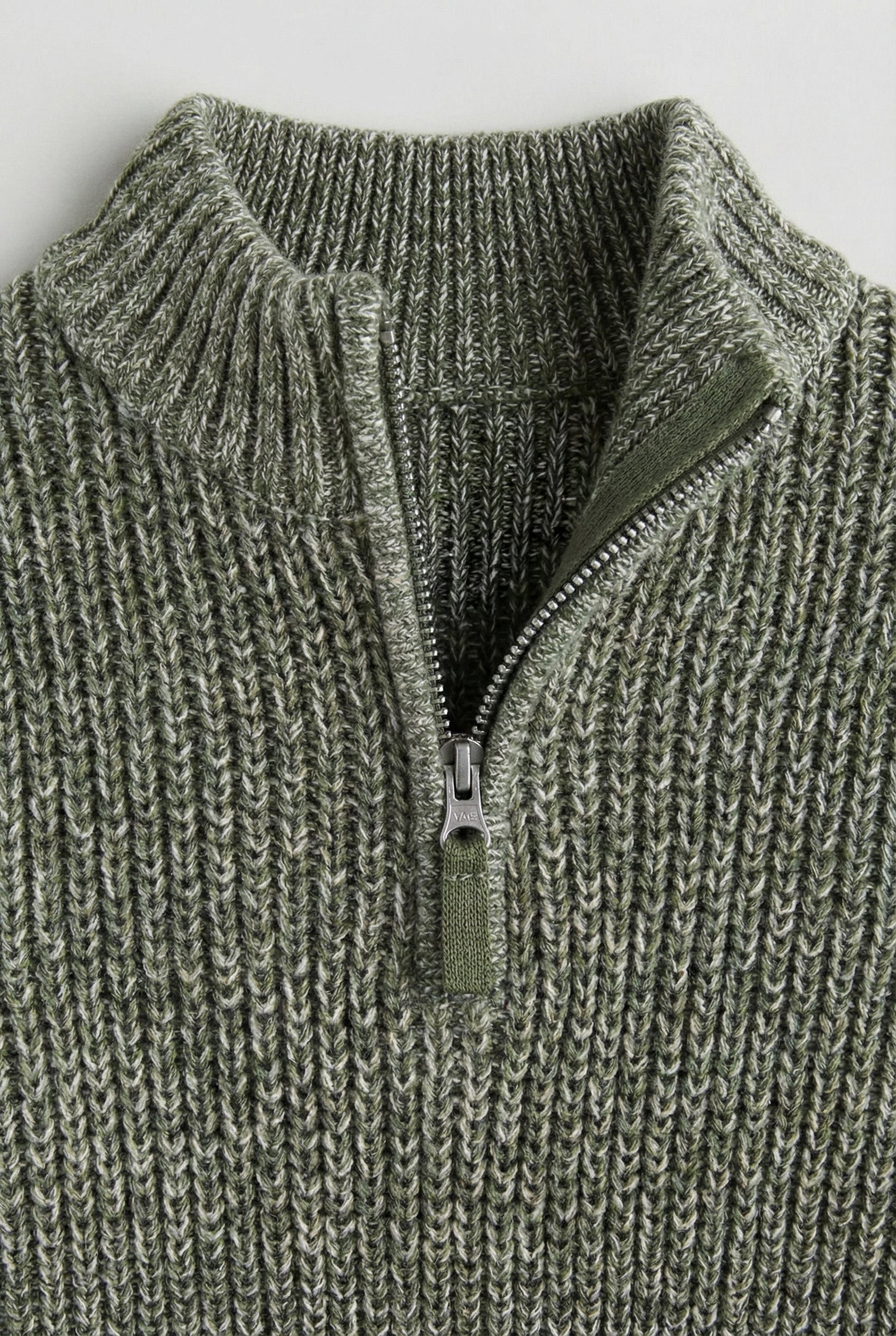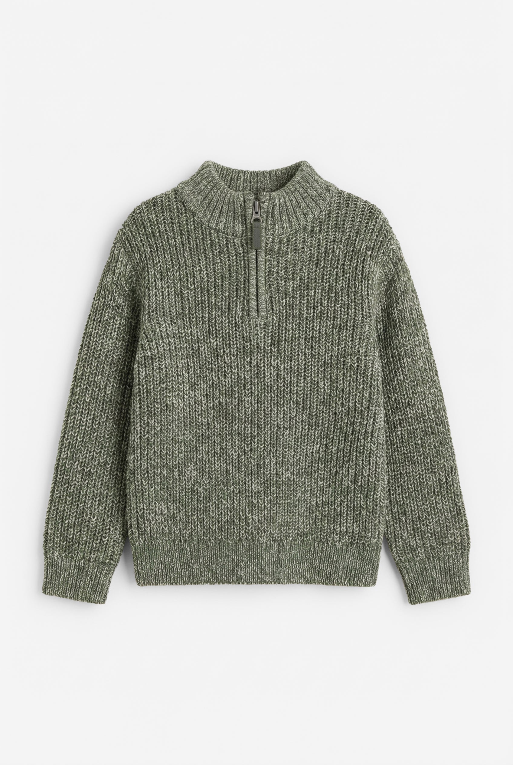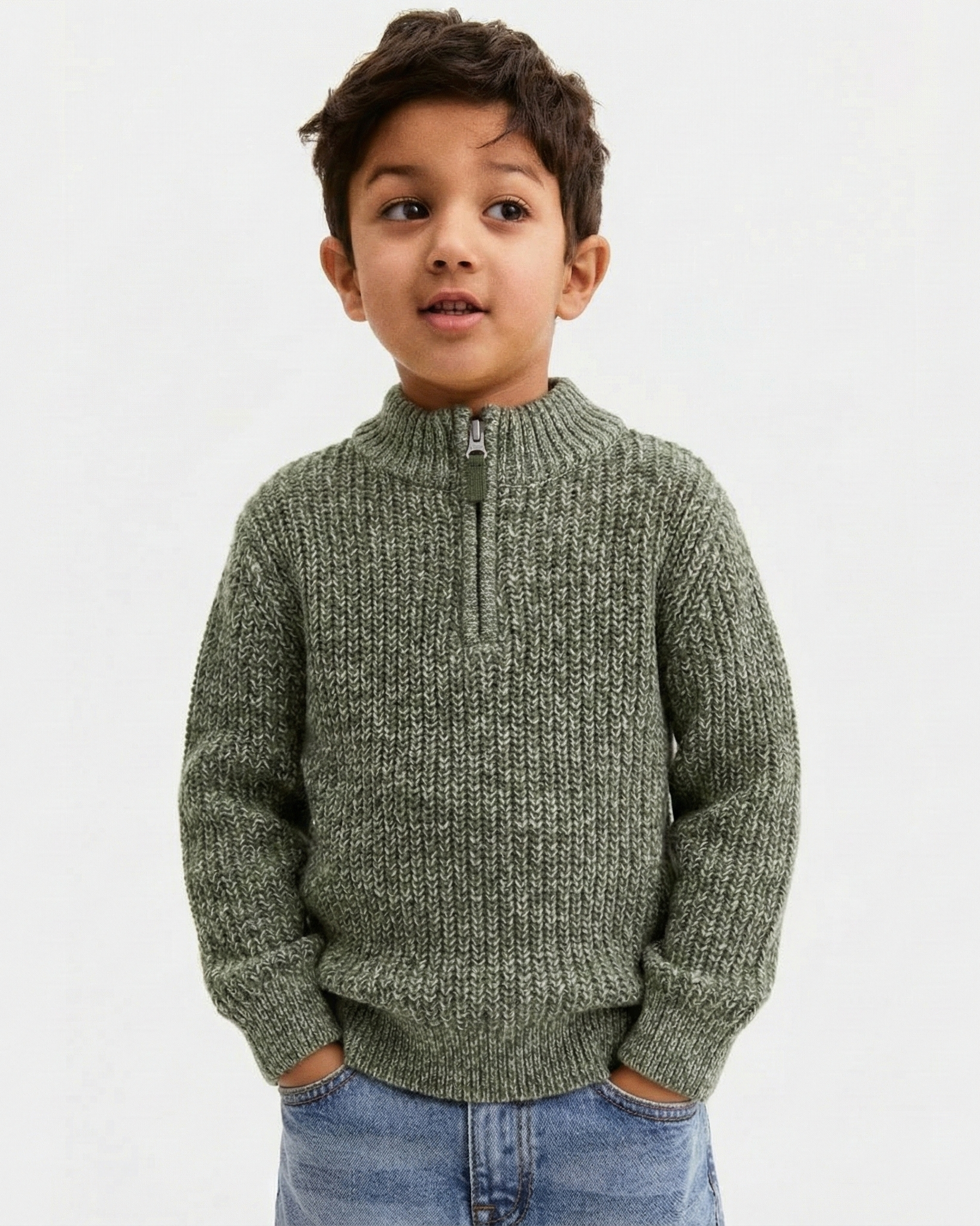 Get him ready for chilly days with this handsome and rugged half-zip pullover. Crafted from a thick, textured knit in a versatile olive green shade, this sweater offers the perfect blend of warmth and style.